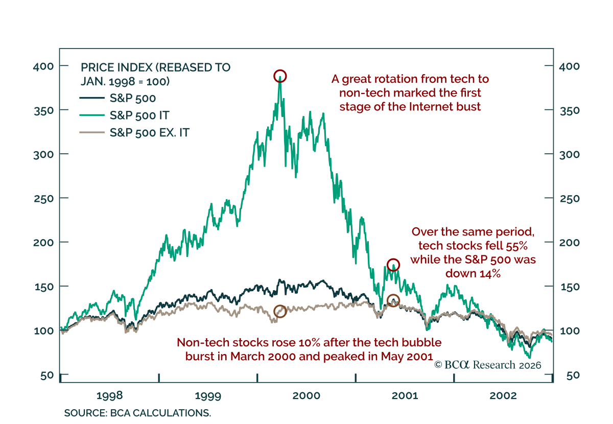 Our Global Investment strategists expect 2026 to follow a two-stage pattern: a “Great Rotation” from tech to non-tech equities in H1, followed by a broader market selloff in H2 as US economic momentum fades. Much like the 2000 cycle, the initial phase of sector rotation may mask deeper fragilities in the underlying growth outlook.