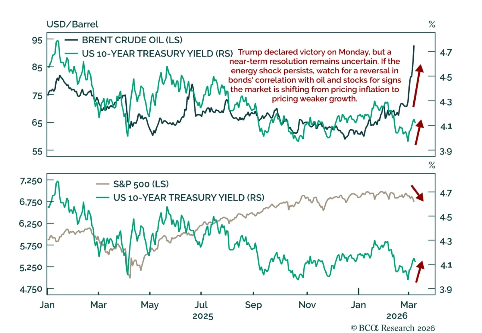 Cross-asset correlations help determine whether inflationary pressures or growth drag are dominating. If the energy shock persists, investors can monitor two key correlations: oil versus yields, and stocks versus yields. Oil and yields have moved higher together across both the 2- and 10-year maturities. A reversal, with yields falling, would suggest a shift from pricing a commodity shock to a safe-haven bid. Meanwhile, the stock-yield correlation has been negative, with rising yields and falling equities. A shift to a positive correlation would signal growth concerns overtaking inflation risks.