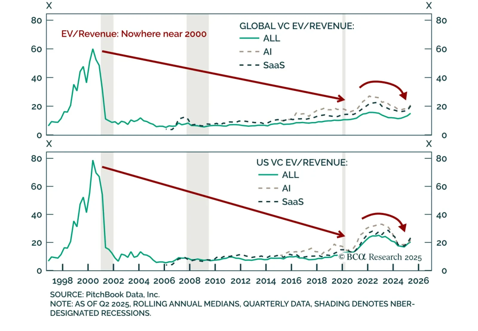 Our Private Markets & Alternatives strategists argue that AI Venture Capital valuations are elevated but not indicative of a 2000-style Tech Bubble… yet. AI now accounts for one-third of all VC activity, having overtaken SaaS…
