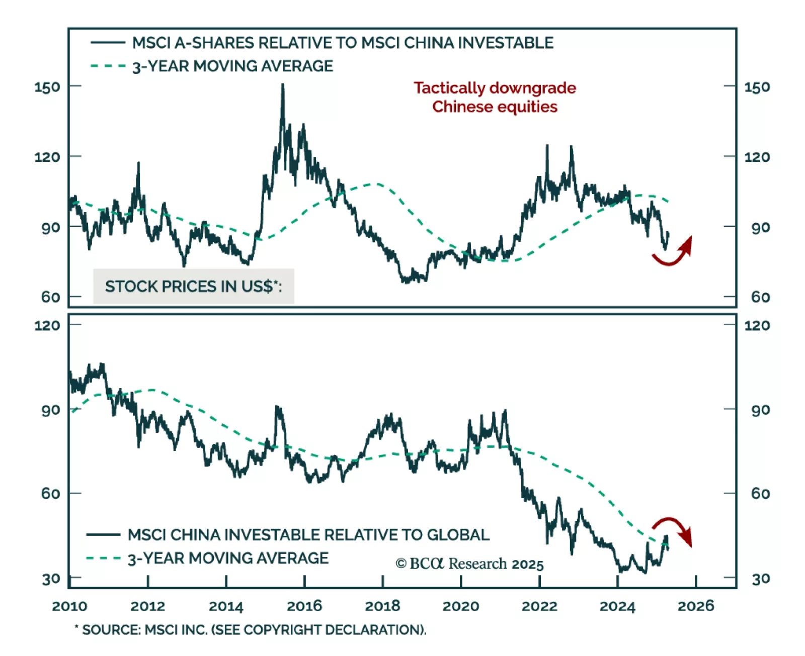 Our China strategists remain defensive and tactically downgrade MSCI China to underweight, citing escalating US China tariff tensions and subdued domestic demand. Favor government bonds over equities, defensive sectors, and A-Shares…