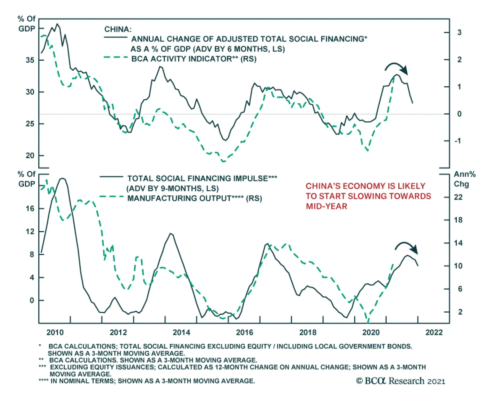 Fiscal policy has also been consolidating with a renewed focus on reducing local government debt load and financial risks. A delay in local government bond issuance in Q1 could potentially boost bond sales in the second half of the year. However, as we noted late last month, without a synchronized policy push for more bank loans and loosened regulations on provincial government spending, an increase in special-purpose bond issuance alone will not make a significant difference in infrastructure investment nor economic growth. We still expect China's economy, which lags the credit cycle by six to nine months, to start weakening by mid-2021 (Chart 3A & 3B). Chart 3ADomestic Economic Growth Set To Slow