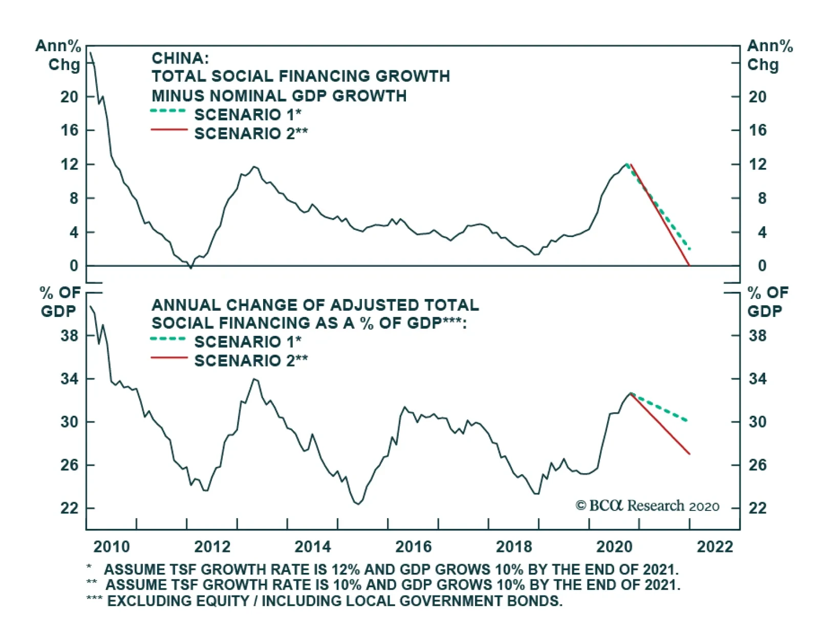Furthermore, the ongoing deflation in the ex-factory prices should not stop the authorities from scaling back policy support. It is worth noting that Xi’s administration doubled down on squeezing shadow banking activity in early 2017 when the CPI was decelerating; the PPI turned positive only due to a low base factor from deep contractions in 2016 (Chart 7). In this vein, as long as the deceleration in both the CPI and PPI does not drastically worsen, we think that policymakers will see less need to reflate the economy. China’s external environment will be less challenging in 2021 than in 2016/2017. Geopolitical tensions are set to ease, at least temporarily, with US President-elect Joe Biden taking office in January. This contrasts with 2016/2017 when President Xi began his financial deleveraging campaign despite increasing strain from then newly-elected President Donald Trump. In hindsight, Xi’s intention may have been to solidify China’s financial sector in preparation for a trade war with the US. The same logic can be applied to our view for next year: Xi will accelerate structure reforms to mitigate risk in the domestic economy before the Biden administration turns its focus to China. We do not think the Communist Party’s 100th anniversary next year will prevent Xi from adopting a hawkish policy bias either. Xi plowed ahead with tightening financial regulations in 2017 even as the ruling Communist Party Committee (CPC) was preparing for a generational leadership reshuffle. In the past two years, the escalation in US-China tensions has strengthened Xi’s power in the CPC and Chinese society. The recent large number of changes in provincial CPC leaders should help Xi to further consolidate his centralized power over local governments. All signs indicate that both the domestic and external landscapes should provide Xi with even more room to undertake reforms in 2021 compared with 2017. Key Theme #2: Stimulus: Deceleration Ahead A deceleration in both credit growth and fiscal support in 2021 is almost a certainty in light of the more hawkish tone by Chinese policymakers. Chart 8 shows that between 2017 and 2019, policymakers came close to stabilizing the macro leverage ratio, but the progress was more than reversed this year due to the pandemic. If policymakers are to allow the increase in the 2021 debt-to-GDP ratio to be within the range of the past four years, then credit may expand at a rate slightly above nominal GDP growth in 2021 (assuming nominal output growth at around 10-11% next year). This scenario, which is our baseline view, is in line with recent statements from the PBoC, which calls for aligning credit growth with nominal GDP in 2021. Our calculation suggests that credit impulse will reach around 29% of next year’s GDP, about 2 to 3 percentage points lower than in 2020 (Chart 9). Chart 8Financial Deleveraging Efforts Erased By COVID-19
