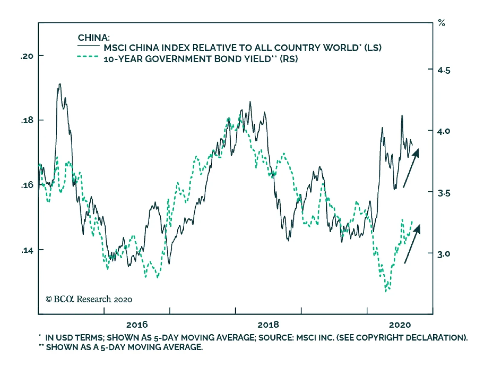 Despite a minor drop in the construction PMI sub-index due to heavy rains and floods in China’s central provinces, the acceleration in service activities pushed the non-manufacturing PMI to its highest level since early 2018 (Chart 4). China’s domestic COVID-19 infection rate remains low, giving rise to a rebound in service sector’s activities, such as tourism, catering, sports and entertainment. The resumption rate of theater operations reached 88% by the end of August. While the year-over-year growth rate in total retail sales of consumer goods remains negative, household purchases from larger enterprises registered a 2.2% increase in July (Chart 4, bottom panel). The normalization of activities in the service sector, coupled with the upcoming holiday season in September/October, will further support China’s household consumption recovery. China’s central bank and housing authorities have reportedly rolled out new rules to curb borrowing among overly indebted property developers. We do not expect the new directions to have a significant impact on our near-term outlook for real estate activities. Bank loans account for less than 15% of Chinese property developers’ funds, compared with down payments at 35%. Therefore, strong housing demand should more than offset any potential pullback in bank lending to property developers (Chart 5). Despite some pullbacks in the prices of Chinese stocks of late, we do not think that the cyclical upturn in Chinese stocks has run its course. Even though the PBoC seems to have normalized its post-COVID 19 monetary policy, monetary conditions remain very accommodative and fiscal stimulus will accelerate the pace of credit expansion through Q3.3 Continued money creation should prop up both China’s economic recovery and stock outperformance, in absolute terms and relative to global benchmarks. In addition, 10-year government bond yields rose 15bps in the past month and are now 66bps above their April low. The mounting bond yields on the back of an improved economic outlook, coupled with the continued outperformance in Chinese cyclical stocks over defensives, also support our constructive view on Chinese stocks on a 6-to-12 month basis (Chart 6). Chart 5Demand Should Continue Driving Property Sector Growth