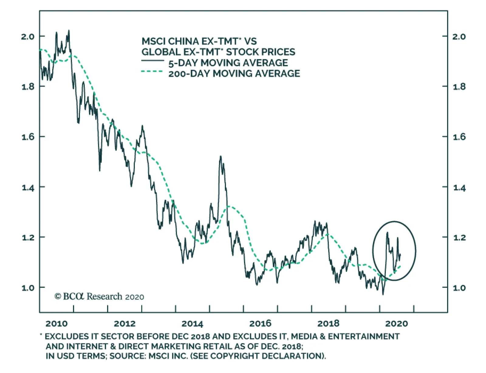 Geopolitical risks again stirred up volatility last week in China’s equity markets. President Trump issued two executive orders to take effect in 45 days, banning US transactions with the Chinese-owned social media apps TikTok and WeChat. Shares in Tencent, the China-based Internet giant that owns WeChat, have plummeted by 11% in China’s offshore market following the ban announcement (Chart 1). The event underscores that technology is at the root of a power struggle between the US and China. The struggle will likely be exploited by Trump as the US presidential election nears and Trump’s polling numbers lag. However, we remain constructive on Chinese stocks over the next 6 to 12 months. Although the latest development remains highly fluid, the tensions should not have a material impact on the cyclical outlook for China’s aggregate economy or financial markets. This will be the case as long as the situation does not degenerate into an outright tariff increase on Chinese export goods or other strategic actions with the potential to cause major economic damage. Given rising downside risks to Chinese tech company stocks in the near term, we recommend investors hold a neutral position on Chinese tech giant company equities versus their global peers. Instead, investors should overweight Chinese “old economy” stocks as well as sectors that are greatly benefited from policy support. We initiate two trades today: long MSCI China ex-TMT versus MSCI Global ex-TMT;1 and long domestic semiconductor stocks versus global semiconductor benchmark. A New Front In Tech War It is likely that the US will implement the ordered bans in some way. Banning TikTok wasn’t a surprise because the US had amply signaled its displeasure with the app in preceding months. The social media company has rapidly gained US market share and hence access to American users’ data. Its parent company ByteDance is based in Beijing and therefore subject to China’s cybersecurity laws, a major source of bilateral tensions. The company originated in a Chinese acquisition of an American company, another irritant for the Trump administration. The US is now pressuring TikTok’s US operations to sell the app to an American-based company such as Microsoft. Regarding Trump’s executive order on WeChat and Tencent, it is not clear what “transactions” with Tencent will be disallowed from the US market.2 Additionally, US officials later appeared to backpedal and limit the scope of the executive order on Tencent to only the WeChat app. We have a few preliminary observations on the evolving situation: It is unknown how far the executive action will go regarding Tencent. The Internet titan gets less than 5% of its revenues from outside China, according to its 2019 financial statement. However, Tencent has many prominent investments in the US gaming and music industries. The US Commerce Department has 45 days to interpret and enforce the directive. The vague language in the executive order provides the US with enough legal space to deprive Tencent of US technologies in those sectors, and would severely curtail Tencent’s online gaming business, which is its main engine of growth. The bans underscore the US administration’s intention to extend tech hostilities with China by denying Chinese tech companies the access to compete and expand globally. Last week, Secretary of State Mike Pompeo announced a five-pronged “Clean Network” initiative that would scrub Chinese companies from US telecommunications networks entirely.3 China, for its part, has been progressively banning US social media giants since 2009. China has not announced any retaliatory actions since the executive orders were issued. Top Chinese policymakers seem to have shifted gears from a tit-for-tat retaliation to a carefully calibrated diplomatic reaction that does not ramp up tensions further. Moreover, there is a sizeable contingent of top Chinese policymakers pushing for reconciliation with the US. We think that China’s senior leaders prefer to dial down the current conflict and take a wait-and-see approach until after the US presidential election in November. Nevertheless, the next two to three months will be unpredictable as the election nears and Trump’s polling numbers lag behind his rival Joe Biden. Bottom Line: China’s leading Internet and tech companies are embroiled in a US-China feud. Pressures will likely intensify with other tech companies potentially also targeted. For now, stay neutral on leading Chinese tech company stocks within a global equity portfolio. Stick With The Knowns Chinese tech company stock prices will likely be extremely volatile in the short run. Nevertheless, we are staying the course with our constructive cyclical view on overall Chinese stocks and we do not recommend any one-way bets on the market during the next two to three months. China’s financial markets have been shaken by negative surprises relating to frictions with the US. However, investors cheer on even the slightest easing of tensions between the two countries. Last Friday’s volatile trading was a good example: initial confusion over the ban’s scope in Trump’s order led to a more than 10% plunge in Tencent stock during morning trading in the Hong Kong market, but the losses were cut in half after the US indicated the ban only affected the WeChat app. Chart 2Chinese Tech Company Stocks Rallied Through Most Of The Trade War