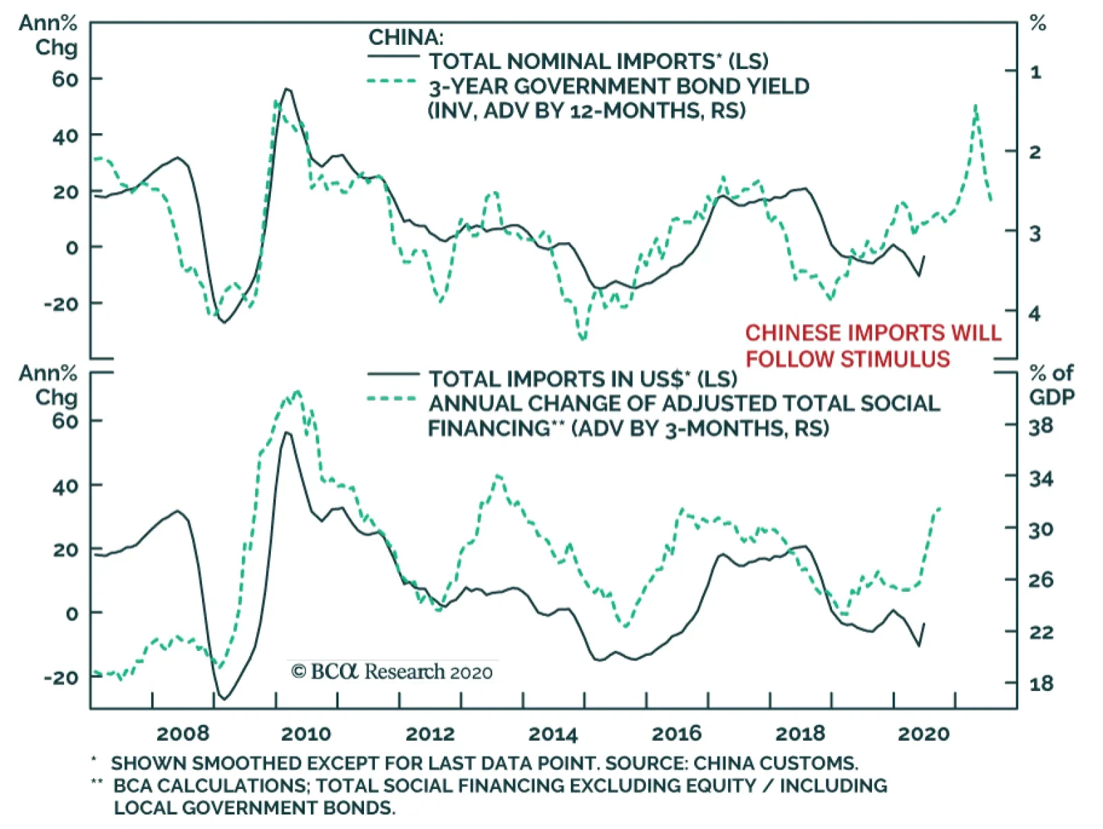 Most of the rally since the March lows has been due to “new economy” stocks. Share prices of “old economy” companies did not do that well before July. Tech stocks in the onshore market have gone parabolic (Chart 10, top panel). This contrasts with lackluster performance of materials, industrials, and property stocks (Chart 10, bottom panels). Critically, in the onshore market, tech stocks are trading at the following trailing P/E ratios: the market cap-weighted P/E is 155, and the median P/E is 60. Needless to say, these valuations are outright expensive. Bottom Line: Odds of a repeat of the 2015 boom-bust cycle are low. The rally in Chinese stocks might be due for a pause. On June 18, we upgraded Chinese stocks to overweight from neutral within the EM benchmark, a recommendation that remains intact. We have a much lower conviction on the absolute performance of Chinese stocks in the near-run. China And Commodities An important question to address is whether the rally in commodities in general and copper in particular are signals of a sustainable recovery in the mainland economy. Without a doubt, economic conditions in China have been improving, and infrastructure spending has been accelerating. However, the magnitude of the upswing in copper prices is excessive relative to the strength of the Chinese economy. The spike in resource prices in general and copper in particular has been due to three forces: (1) China’s unprecedented super-strong imports; (2) global investors buying commodities; and (3) output cuts. It is highly unlikely that commodity demand in China is this strong. In our opinion, this reflects restocking. Chart 11 shows that Chinse imports of copper and copper products surged by 100% in June from a year ago, while imports of steel products increased by 100% and oil import volumes rose by 34%. It is highly unlikely that commodity demand in China is this strong. In our opinion, this reflects restocking. Provided cheap credit availability, wholesalers, intermediaries or users of commodities have rushed to buy before prices rise further. In the case of copper, it will take several months before the real economy absorbs that much of the red metal. Hence, China’s copper imports are poised to relapse in the coming months. Chart 12 illustrates that investors’ net long positions in copper have risen to their highest level since early 2019. Consistently, the July Bank of America/Meryl Lynch Global Fund Manager Survey revealed that as of early July, portfolio managers had built up their largest net long positions in commodities since July 2011. Not only oil but also copper and iron ore prices have benefitted from production declines. Due to surging COVID infections, Chile and Peru have sharply reduced copper output and Brazil has curtailed iron ore production. Chart 11Chinese Imports Of Commodities Have Surged