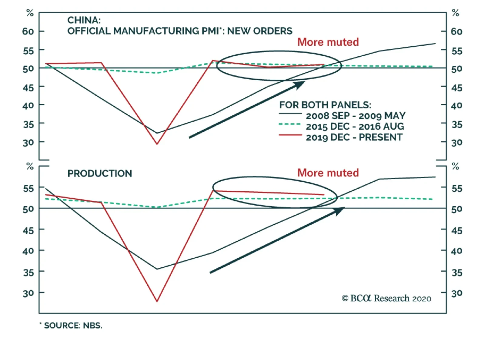 Still, hedge funds have not yet entered bullish positions on the metal. And, importantly, inventory levels are not drawing sharply. China’s Economy Bottomed, World ex-China Still Contracting Our outlook hinges primarily on our assessment of China’s policy-driven copper demand – both from domestic usage perspective, and, to a lesser extent, from copper-intensive exported goods. Since the end of the Global Financial Crisis (GFC), copper prices have mostly shadowed China’s economic cycles (Chart 5). China’s importance for copper markets now dominates that of major DM countries (Chart 5, panel 3). The influence of global supply-demand fundamentals on copper prices has declined. Prices are increasingly policy-driven with supply adjusting to demand as dictated by Chinese policymakers’ decisions on the allocation of total social financing funds in that economy. Thus, our outlook hinges primarily on our assessment of China’s policy-driven copper demand – both from domestic usage perspective, and, to a lesser extent, from copper-intensive exported goods. According to the International Copper Study Group (ICSG), around 17% of Chinese copper demand comes from exports of products containing copper.1 In “normal” times, we rely heavily on our monthly indicators to gauge economic and commodity cycles. However, the speed with which the COVID-19 pandemic evolves – and the associated fiscal and monetary responses to it – makes short-term forecasting of cyclical commodities a perilous task. Chart 5DM Consumption Pales Vs. China