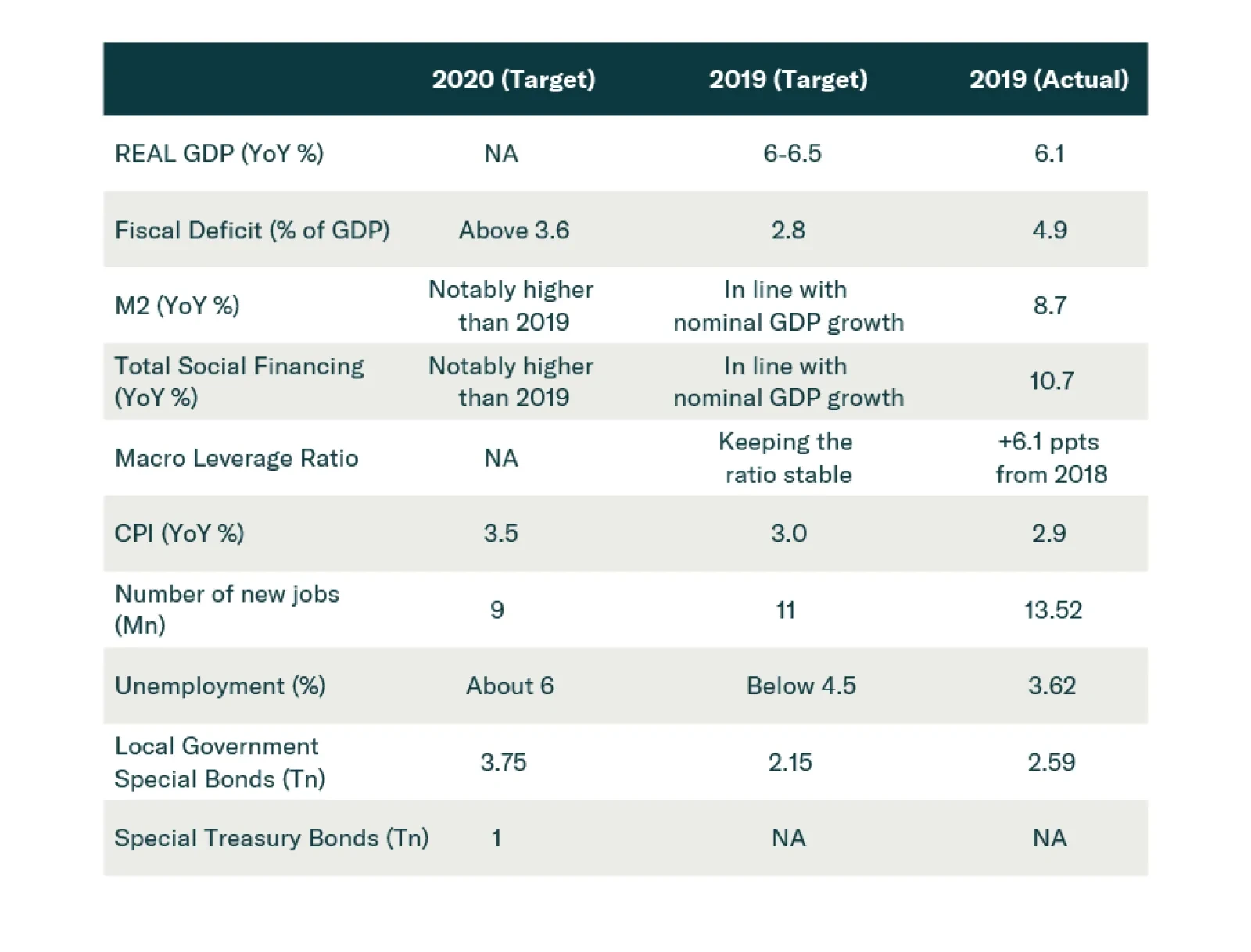 Numeric targets in the stimulus package announced at the NPC did not exceed the consensus. However, citing global geopolitical and economic uncertainties, Chinese policymakers have kept the liquidity tap open and the fiscal budget flexible. This means that policymakers can add to the existing stimulus without the approval of the NPC at the Politburo’s mid-year review in July. Investors will likely turn their focus back to economic fundamentals in the coming months. In Q2, the market will trade on the back of disappointing corporate earnings and news from the geopolitical front. In H2, however, a confluence of further domestic policy easing and a global economic recovery should lift Chinese corporate earnings. As such, our cyclical (6-12 months) outlook on both China’s economic recovery and equity performance remains upbeat. The Economy: No Growth Target ≠ No Growth The GWR set targets for this year’s urban job creation and unemployment rate, even though it refrained from setting an explicit objective for economic growth in 2020 (Table 1). A numeric target on job growth implicitly provides a floor to the economy, i.e., stimulus will have to step up if the economy does not provide adequate jobs to meet the employment target. Table 1No Growth Target, But Big Spending