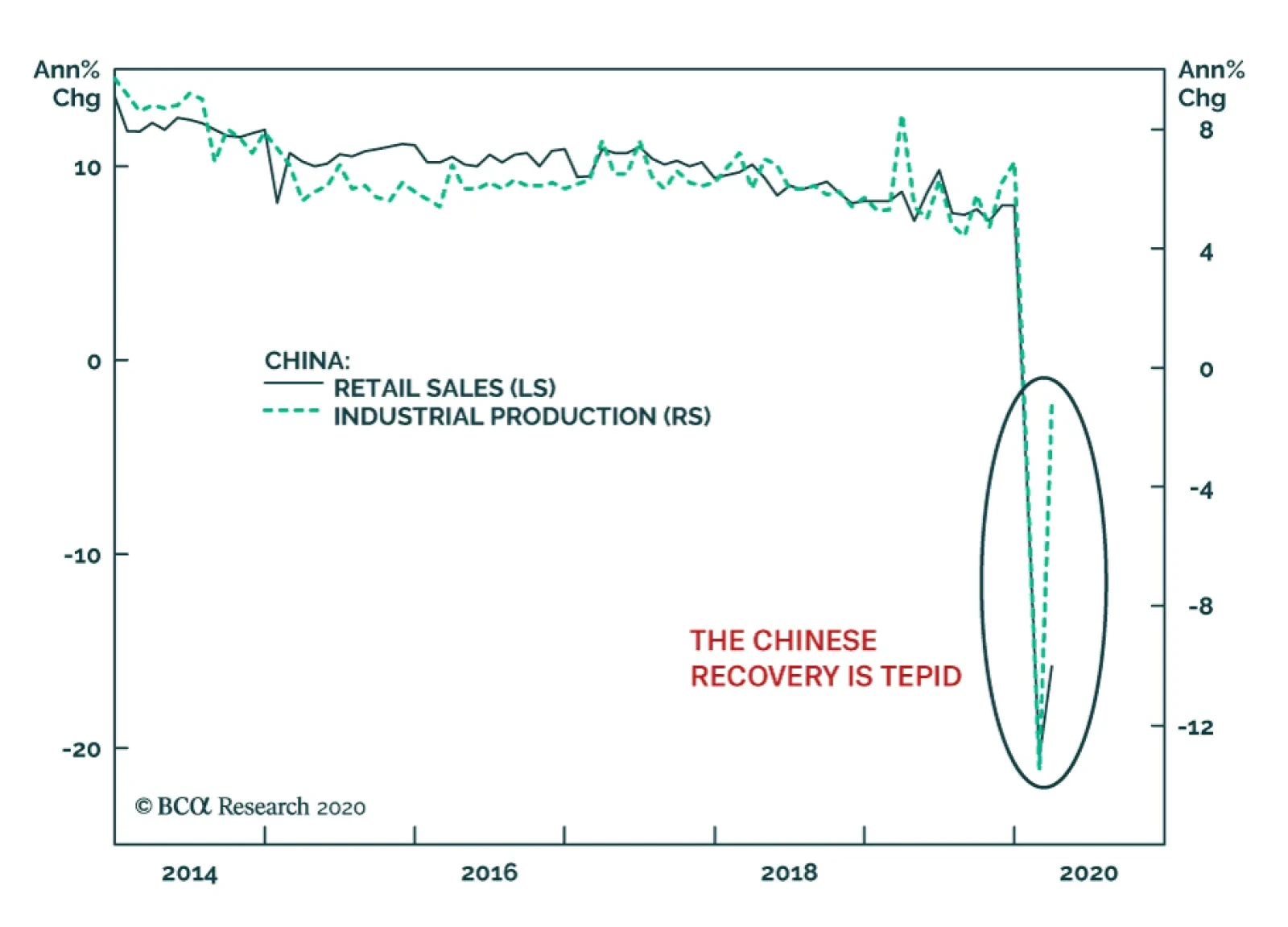 The flattening of the resumption rate curve is due to a lack of strong recovery in demand. Although there was a surge in Chinese imports in crude oil and raw materials, the increase was the result of China taking advantage of low commodity prices. This surge cannot be sustained without a pickup in domestic demand. The March bounce back in domestic demand from the manufacturing, construction, and household sectors has all been lackluster (Chart 4). External demand, which growth remained in contraction through March, will likely worsen in Q2 (Chart 5). Exports shrunk by 6.6% in March, up from a deep contraction of 17.2% in January-February. Export orders can take more than a month to be processed, therefore, March’s data reflects pent-up orders from the first two months of the year. The US and European economies started their lockdowns in March, so Chinese exports will only feel the full impact of the collapse in demand from its trading partners in April and May. The work resumption rate will advance only if the momentum in domestic demand recovery increases to fully offset the collapse in external demand. The current 83% rate of work resumption implies that industrial output growth in April will remain in contraction on a year-over-year basis (Chart 6). Chart 5External Demand Will Worsen In Q2
