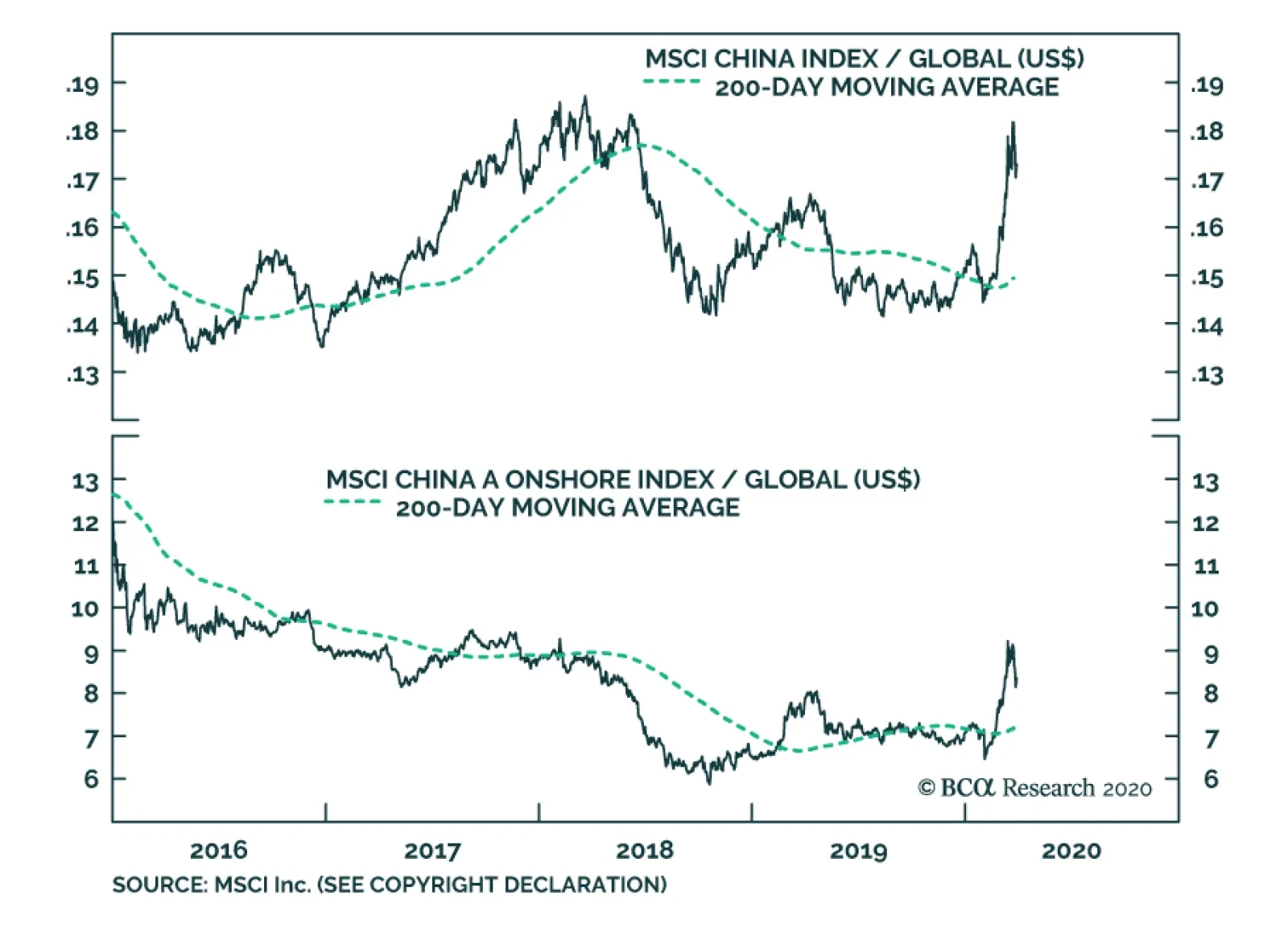 Highlights Chinese stocks have outperformed global benchmarks by a wide margin. We are taking profits on our overweight position, and downgrading our tactical call on Chinese stocks to neutral. In absolute terms, Chinese stocks have failed to buck the trend in a global selloff of risk assets. This suggests Chinese stocks are not immune to worldwide panics. Investors should wait for a peak in the global pandemic before going long on Chinese equities. Chinese stocks have become less cheap relative to global benchmarks. The size of Chinese stimulus is also less impressive compared with other major economies such as the US. Therefore, in order to maintain an overweight stance on Chinese risk assets in a global portfolio, Chinese stocks need to either offer a better price entry point, or a more upside potential in earnings outlook relative to their global peers. Feature Chart I-1Chinese Stocks Have Significantly Outperformed Global Benchmarks...