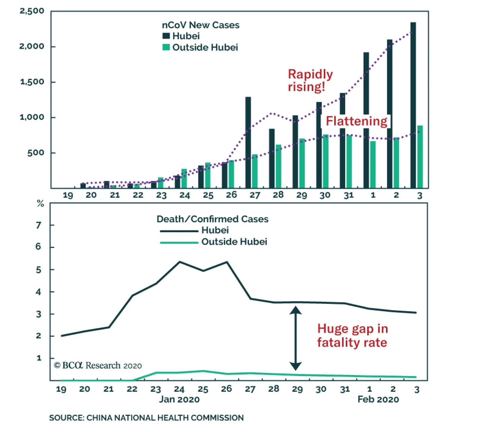 Feature Everyone’s asset-allocation plans for the year have been disrupted by the novel coronavirus (2019-nCoV). Our view is that, while the virus is serious and will hurt the Chinese and global economy in the short term, it does not change the 12-month structural outlook for financial markets. Once the epidemic is under control (which it is not yet), there will be an excellent buying opportunity for risk assets and for the most affected asset classes. Many commentators have pointed to the lessons from SARS in 2003. Markets bottomed around the time that new cases of the disease peaked (Chart 1). But there are risks with such a simplistic comparison. The US invasion of Iraq happened at the same time – between 19 March and 1 May 2003 – with arguably a bigger impact on global markets. The Chinese economy was much less significant: China represented only 4% of global nominal GDP in 2003 (versus 17% now), 7% of global car sales (35% now), and 10-20% of commodity demand (50-60%). And it is still unclear how similar 2019-nCoV is to SARS: it appears to be spreading more rapidly (Chart 2) but (so far, at least) is less deadly, with a mortality rate of about 2%, compared to 10% for SARS. Recommended Allocation