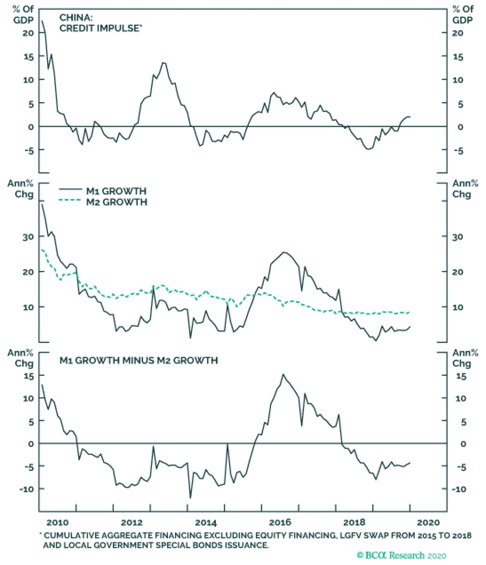 Provided technology, materials and energy stocks account for 33% of the MSCI EM aggregate equity index’s earnings (banks account for another 28% of total profits), it is safe to assume that the growth rate of EM EPS will move from -10% currently to zero or mildly positive territory by mid-2020. Nevertheless, beyond the next several months, our leading indicators on the EM profit outlook are not positive. China’s narrow money growth leads EM EPS by 12 months, and currently suggests the EPS recovery will be both muted and short-lived (Chart I-14). The technical profiles of the KOSPI, EM small cap stocks and copper prices are inconclusive. Further, China’s broad money impulse points to a peak in the credit impulse in the first half of the year (Chart I-15). Given that EM share prices bottomed a year ago, simultaneously with China’s credit impulse, odds are that EM equities could slump with a rollover in the latter. Chart I-14EM EPS: Marginal Improvement Ahead But No Robust Recovery