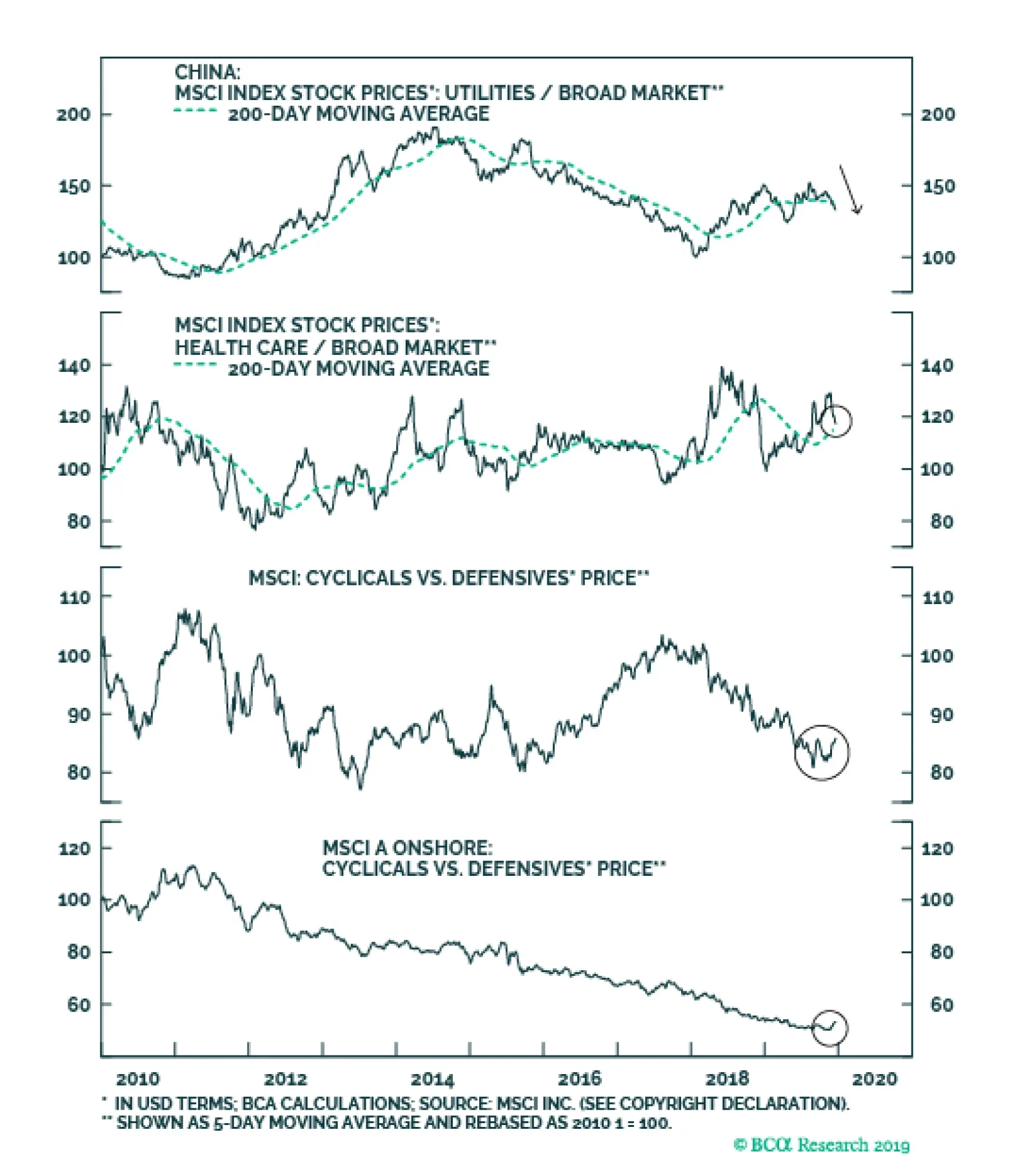 Over the past month, the most notable equity development is that cyclical sectors have outperformed defensives in both the investable and domestic markets and have broken above their respective 200-day moving averages. Among the cyclical sectors,…