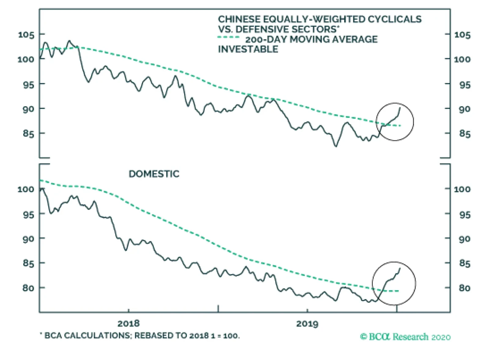 Highlights Incoming economic data suggests that China’s economy is in the process of bottoming, but also that the intensity of a recovery is likely to be more muted than it has been during past economic cycles. Recent Chinese equity market performance is consistent with a bottoming in the economy: cyclicals are outperforming defensives, and both the investable and domestic markets have broken above their respective 200-day moving averages versus global stocks. We continue to recommend that investors cyclically overweight Chinese domestic and investable stocks relative to the global benchmark. However, there is more potential upside for investable than domestic stocks, and the gains in both markets may be front loaded in the first half of the year. Feature Tables 1 and 2 on pages 2 and 3 highlight key developments in China’s economy and its financial markets over the past month. On the growth front, several indicators now suggest that China’s economy is in the process of bottoming, but these indicators also imply that the intensity of a recovery in economic activity is likely to be more muted than it has been during past economic cycles. We see this as consistent with the views presented in our December 11 Weekly Report,1 which laid out four key themes for China and its financial markets for 2020. Table 1China Macro Data Summary