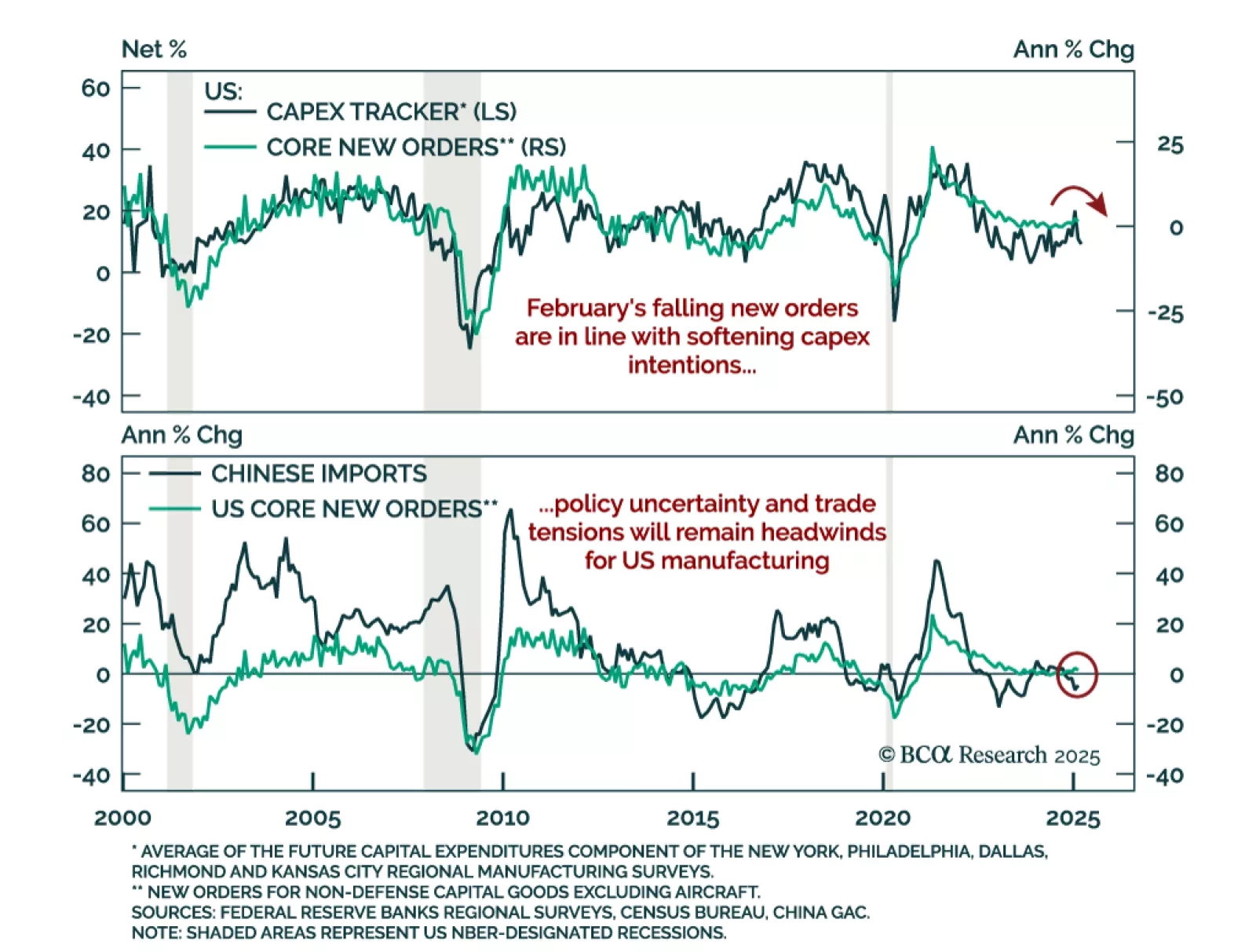 A drop in core capex orders points to slowing business spending and softening global growth. Businesses appear to have front-loaded shipments ahead of potential tariffs while deferring new orders amid policy uncertainty. With hiring…