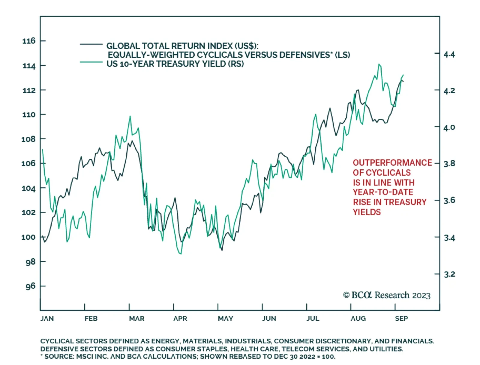 Since the beginning of the year, our equally-weighted global cyclicals index has outperformed equally-weighted defensives by about 13%. As the chart above shows, this relative performance trend has been extremely positively…