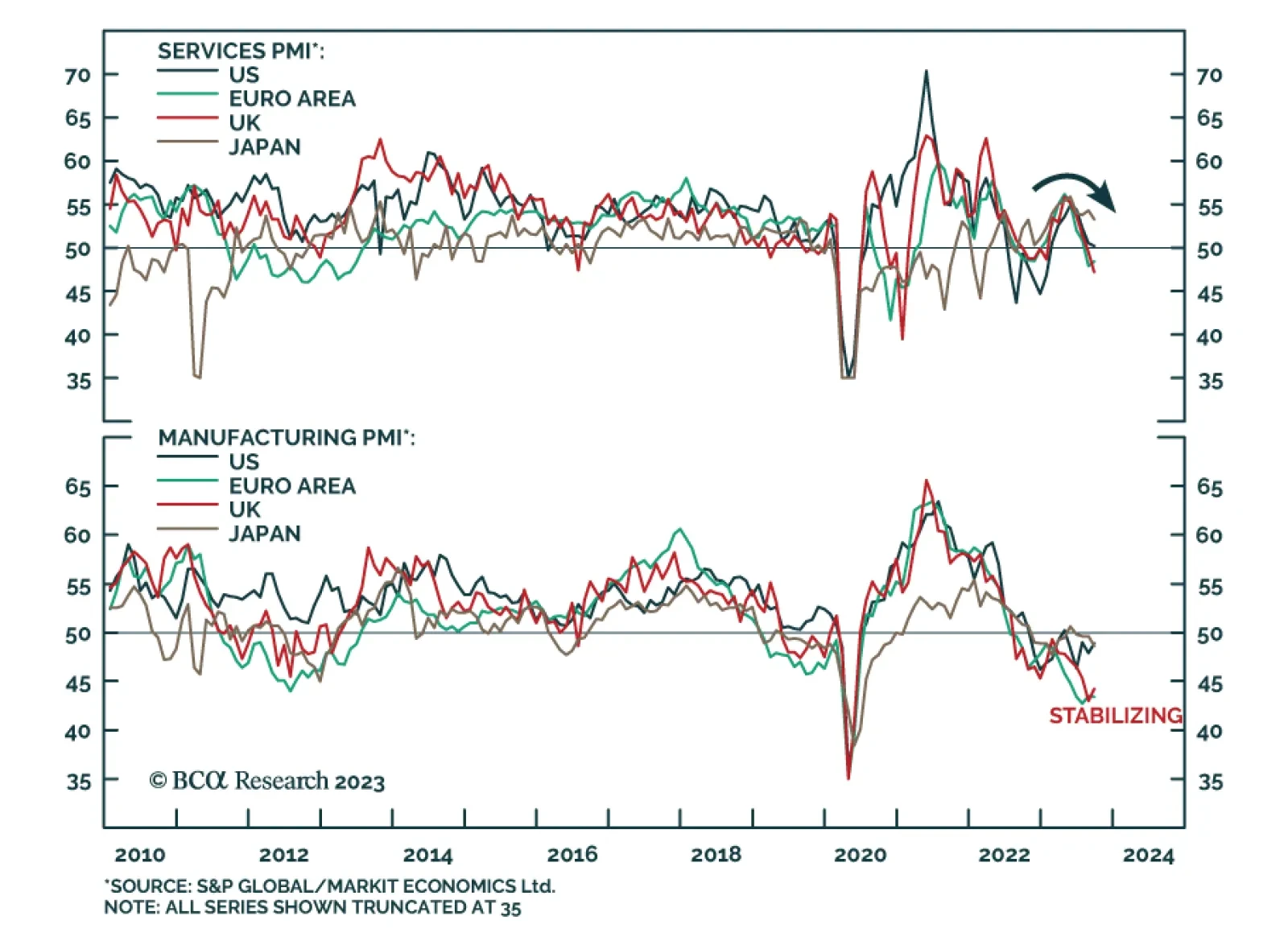 Flash PMIs suggests that the tailwind to services from pent-up demand during the pandemic is easing and that although the global manufacturing downturn is bottoming, it is not meaningfully reaccelerating. In the case of the US…
