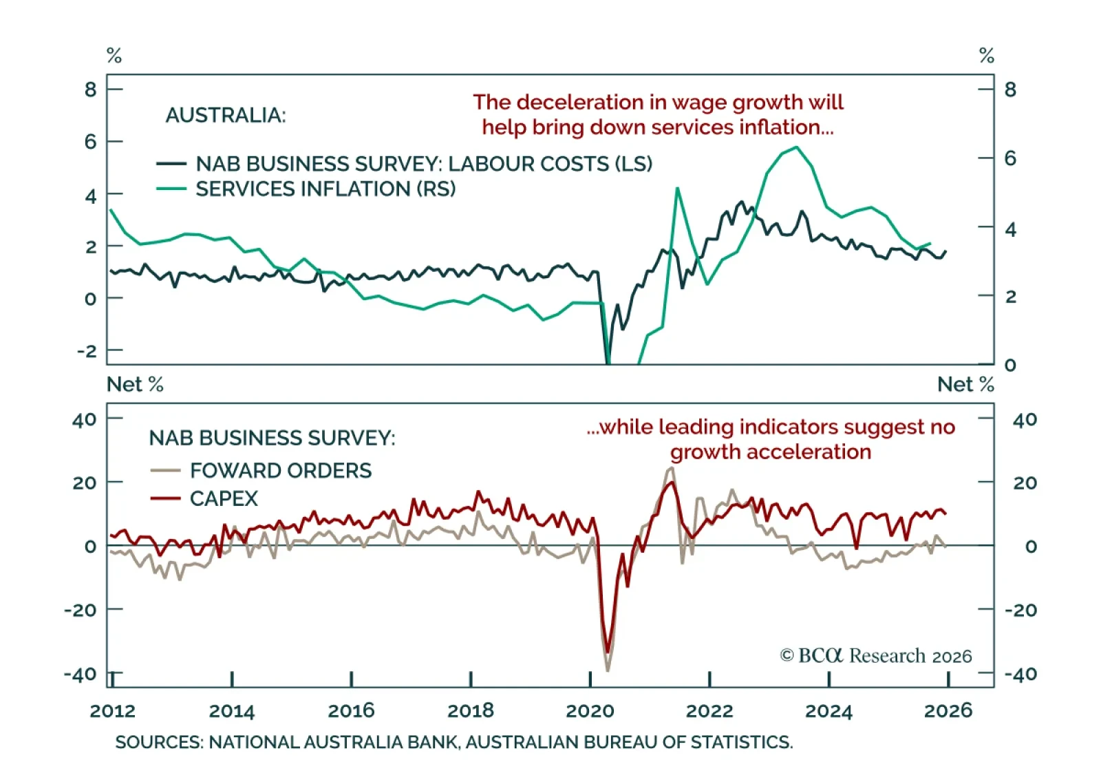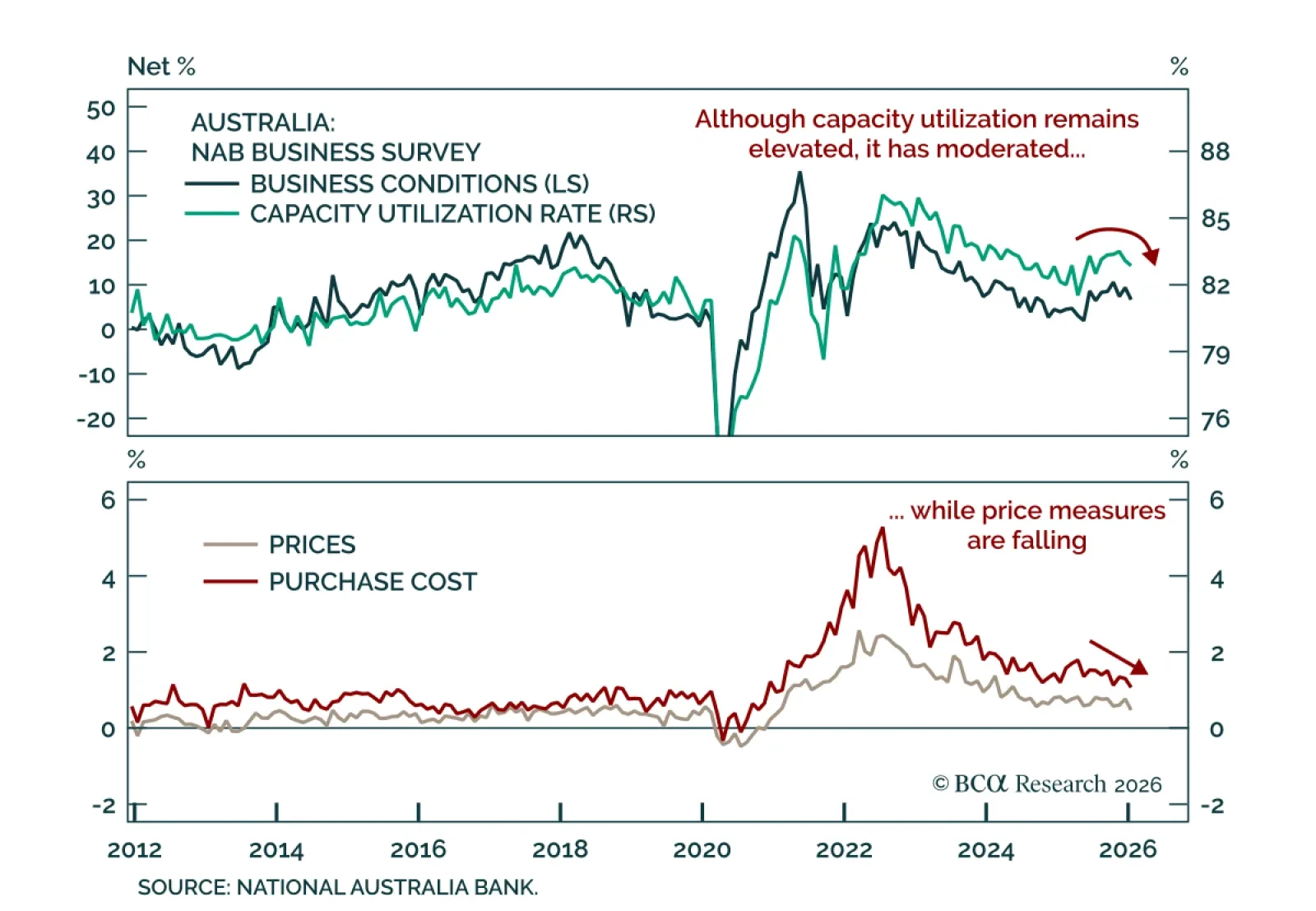 The NAB January survey points to easing Australian inflation pressures, despite recent hot inflation data. Growth signals were mixed: Business conditions eased to +7 from +9, close to the long-term average, while business confidence edged up to +3 from a…