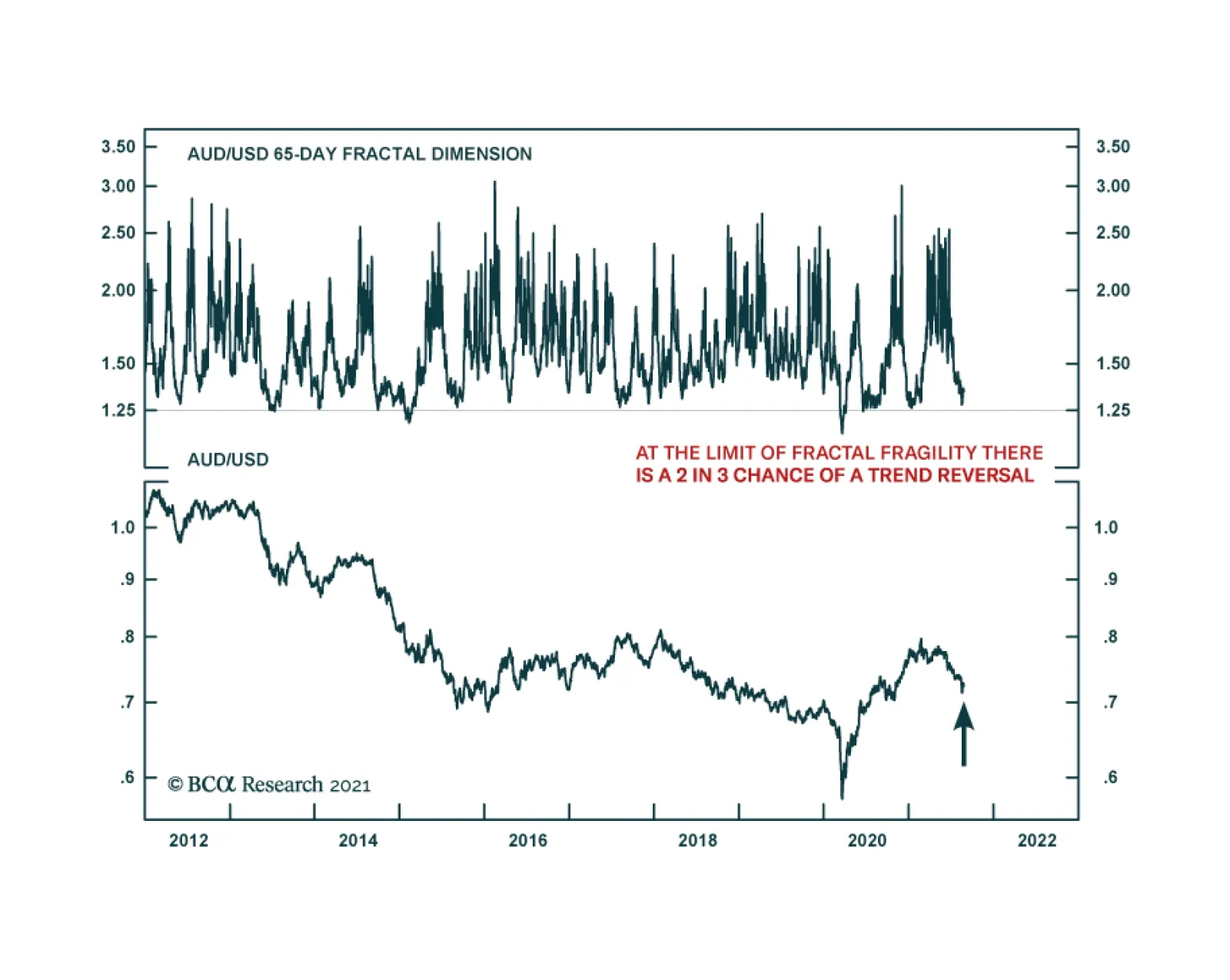 BCA Research's 65-day fractal dimension is signalling a near term counter-trend reversal in the Australian dollar versus the US dollar. When an asset's fractal dimension breaches its natural lower bound, the fractal…