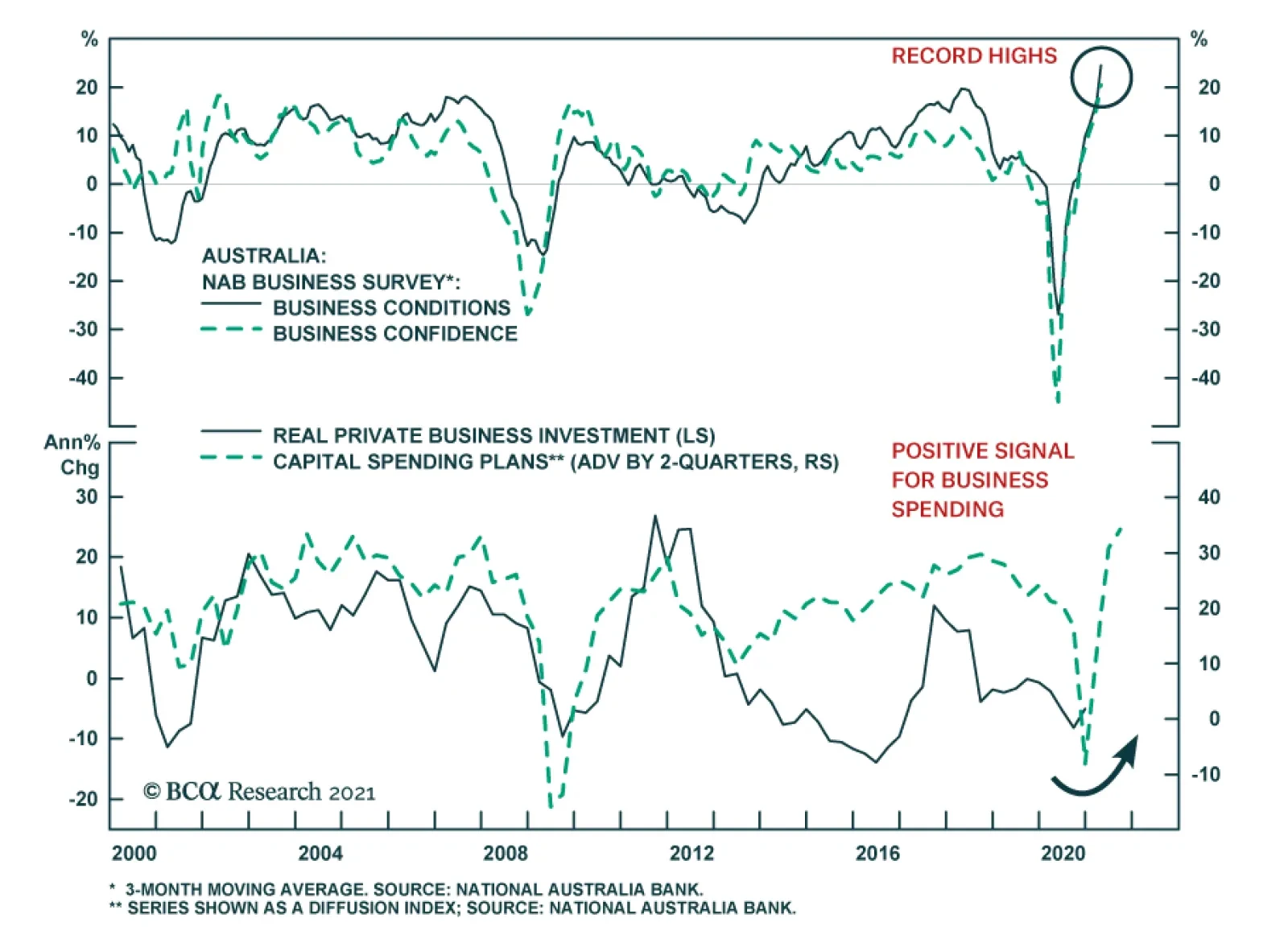 Australia’s NAB Business Survey was extremely strong in April, which indicates that the domestic recovery continues to gather pace. Both the Business Confidence and Business Conditions indices surged to fresh all-time highs…