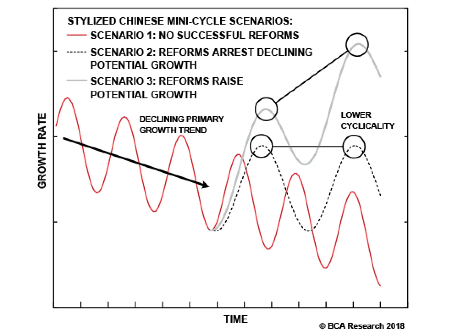 The chart presents three stylized scenarios as a possible multi-year roadmap for investors faced with a “mini-cycle world”. Scenario 1 represents the pessimistic case articulated by Arthur Budaghyan, our chief…