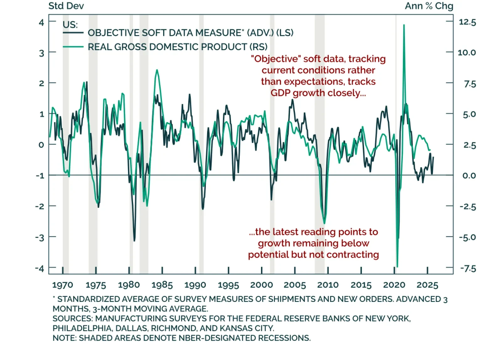 Regional Fed surveys point to low GDP growth, not an outright recession, which tactically supports low growth plays such as duration and tech. These timely surveys provide a snapshot of current month activity, combining “…