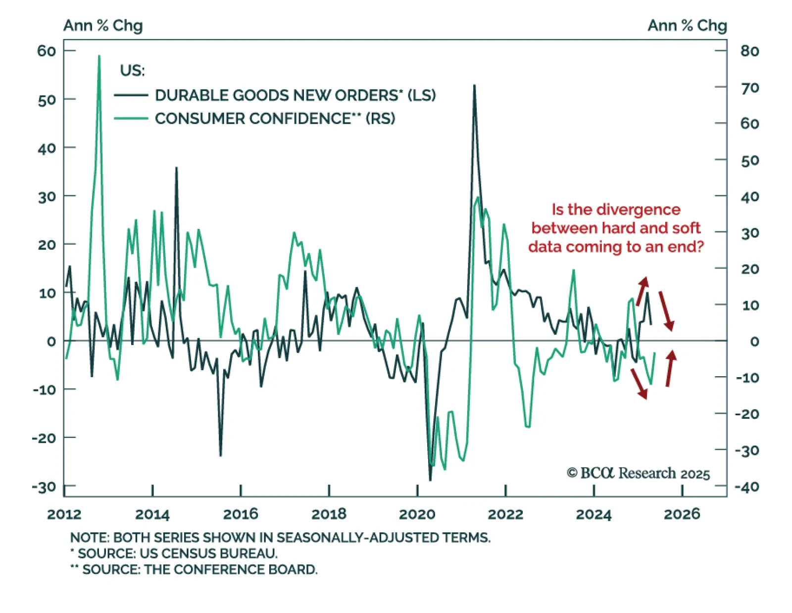 The latest US durable goods orders and consumer confidence figures suggest that hard and soft data are converging, but stocks remain at risk. After months of rising prints, new orders for manufactured goods sank by 6.3% in April…