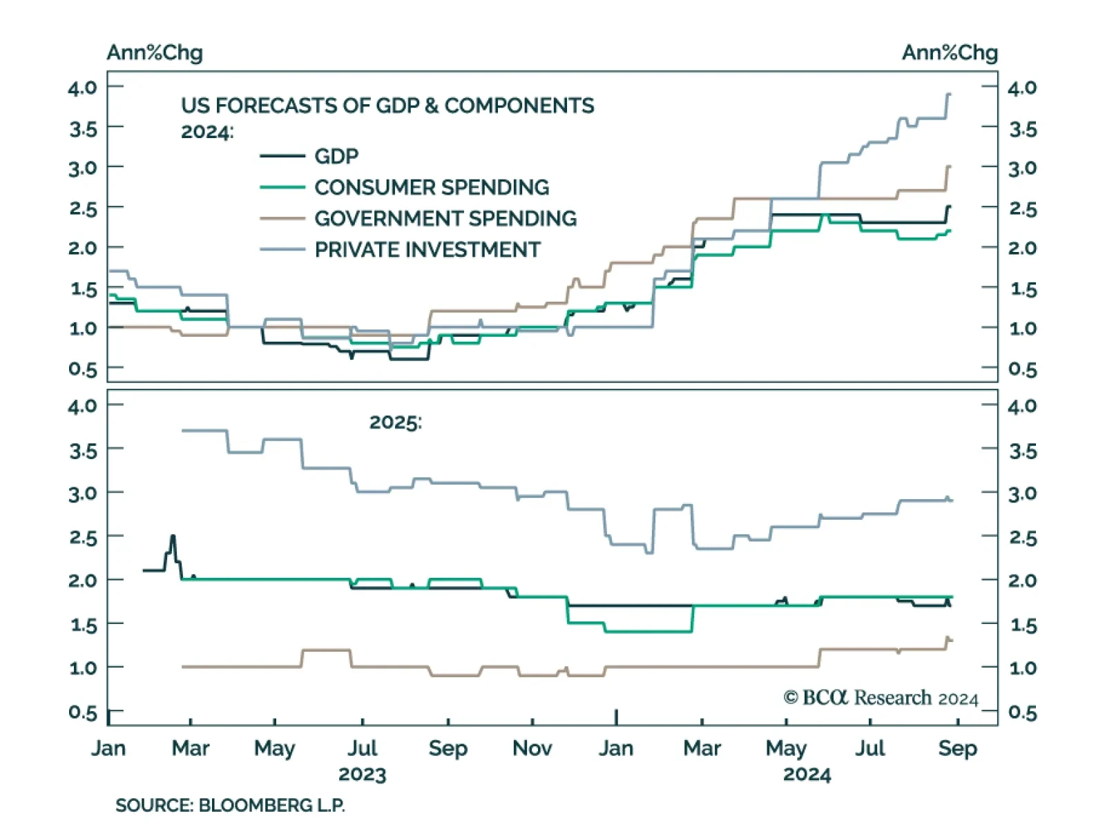 Last week, economists polled by Bloomberg revised their consensus 2024 US GDP forecasts upwards, from 2.3% to 2.5%. Government spending and private investment were both revised 0.3 ppts higher to 3.0% and 3.9%, respectively,…