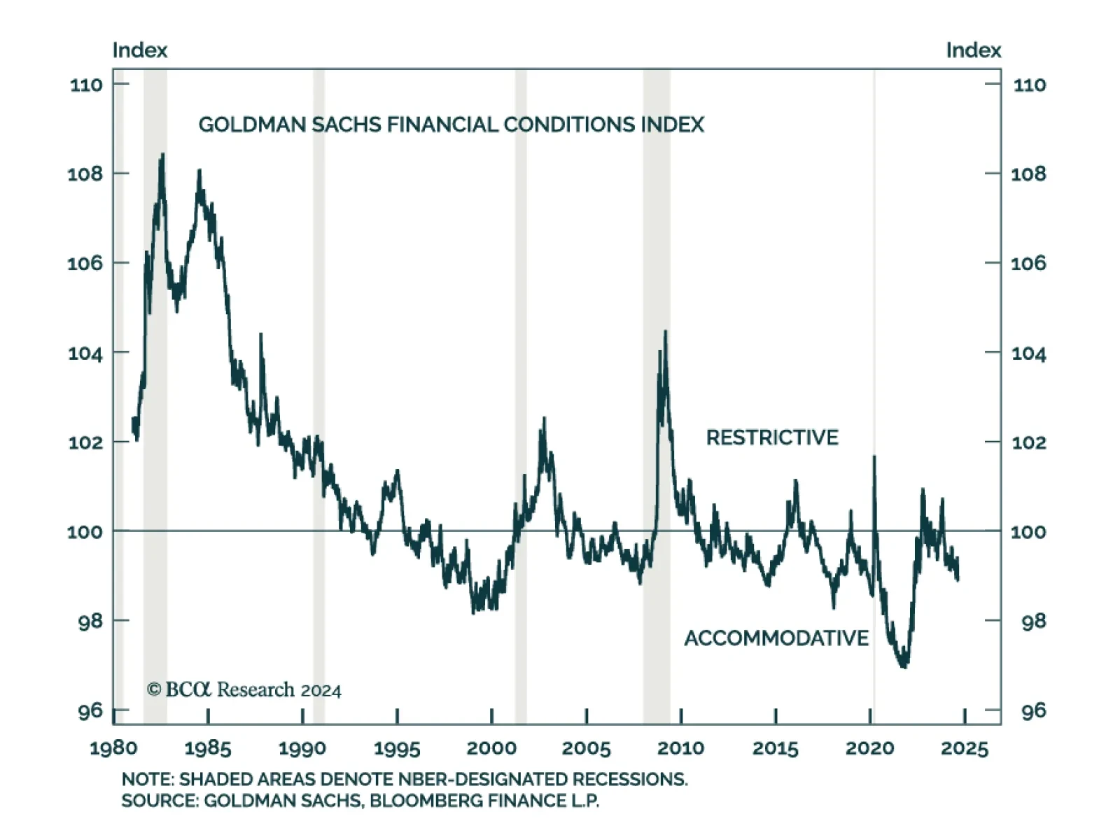 According to Goldman Sachs’ Financial Conditions Index (FCI) financial conditions have become considerably more supportive since the fall of 2023. More recently, the index ticked noticeably lower from 99.4 earlier in August…