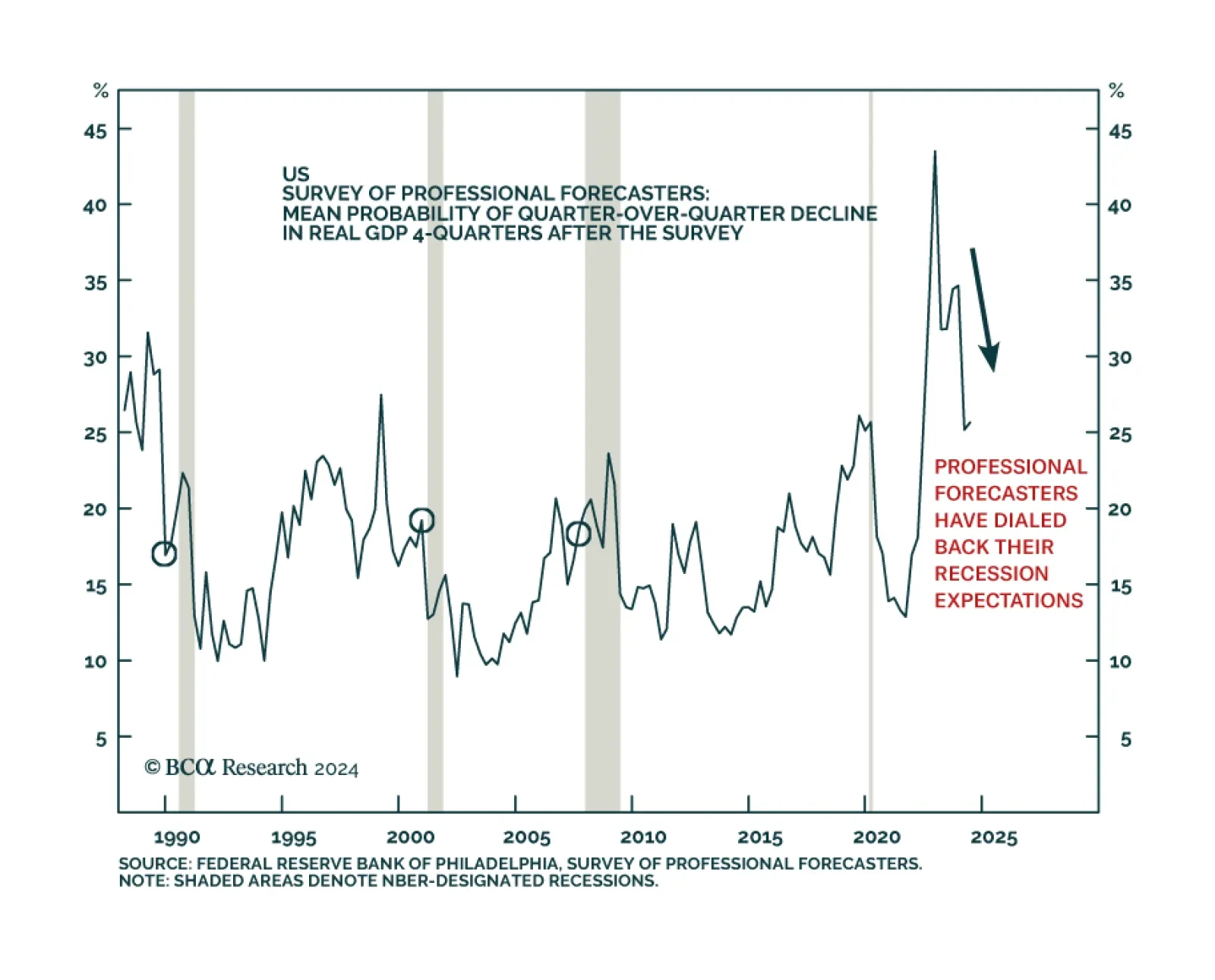 Participants in the Philly Fed’s Survey of Professional Forecasters (SPF) assign a 26% probability to a contraction in US real GDP four quarters from now, down from their 44% peak probability in 2022. The unwieldy…