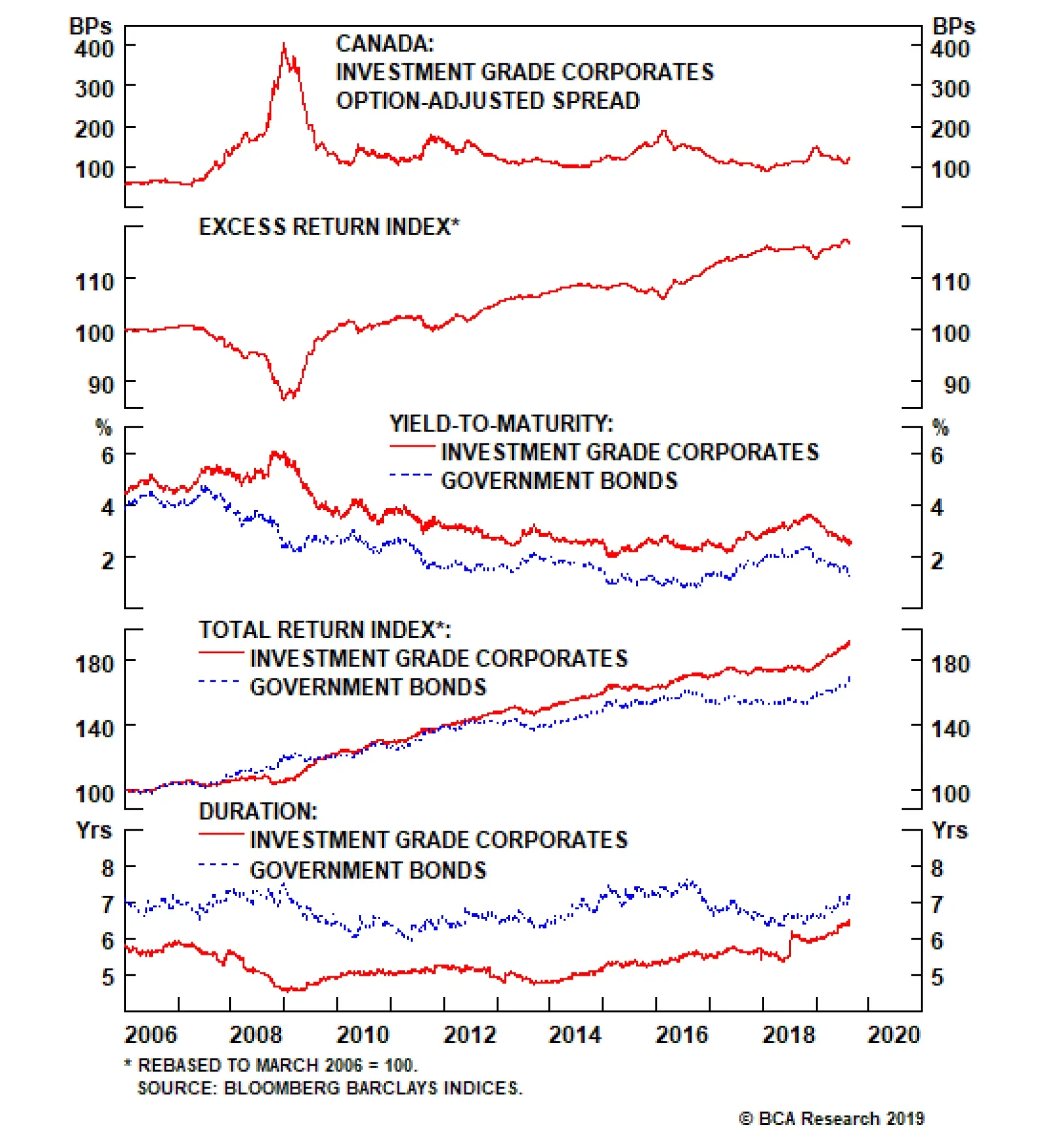 Canadian corporate credit spreads have been remarkably stable since the 2008 Global Financial Crisis. The overall index option-adjusted spread (OAS) has stayed range-bound between 100 and 200bps. Total and excess (duration-…