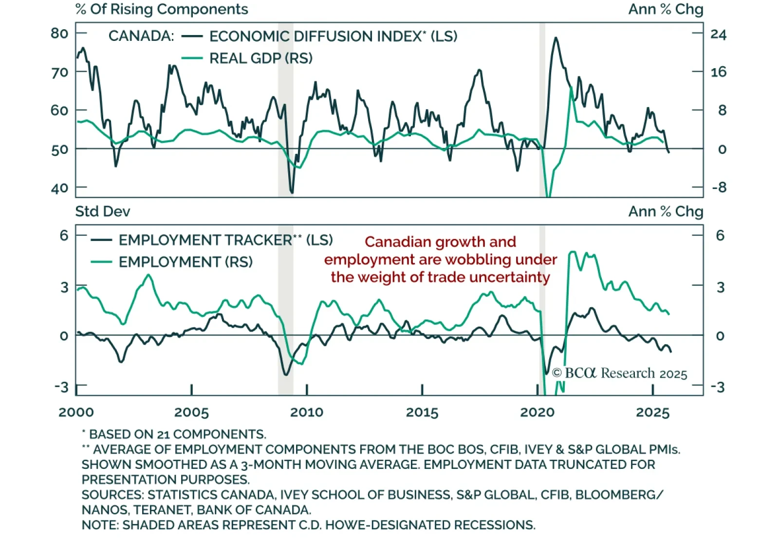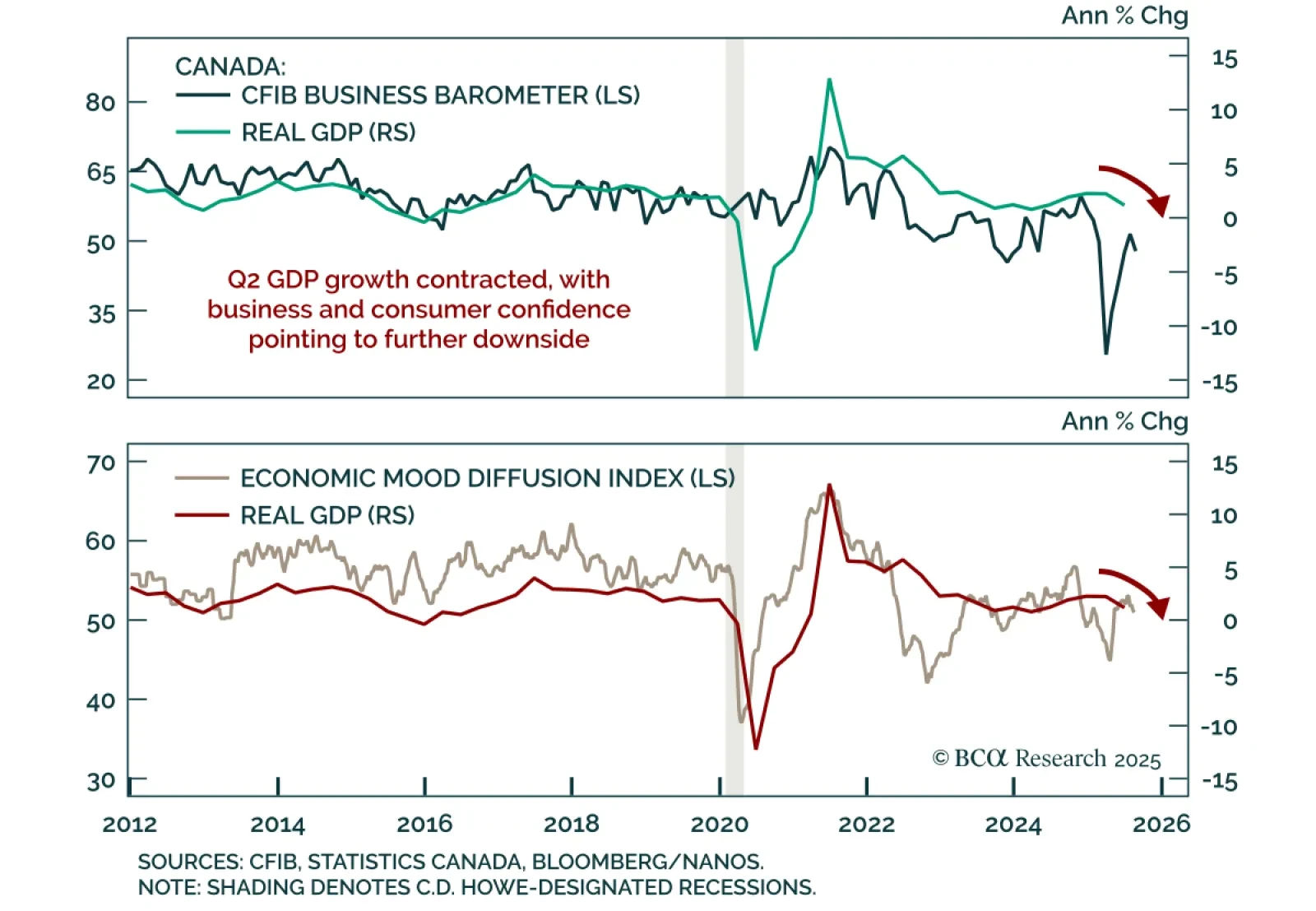 Canada’s Q2 GDP contraction underscores a fragile backdrop where growth risks will outweigh inflation, supporting further BoC easing. Real GDP contracted at an annualized 1.6% after expanding 2.2% in Q1, consistent with survey data…