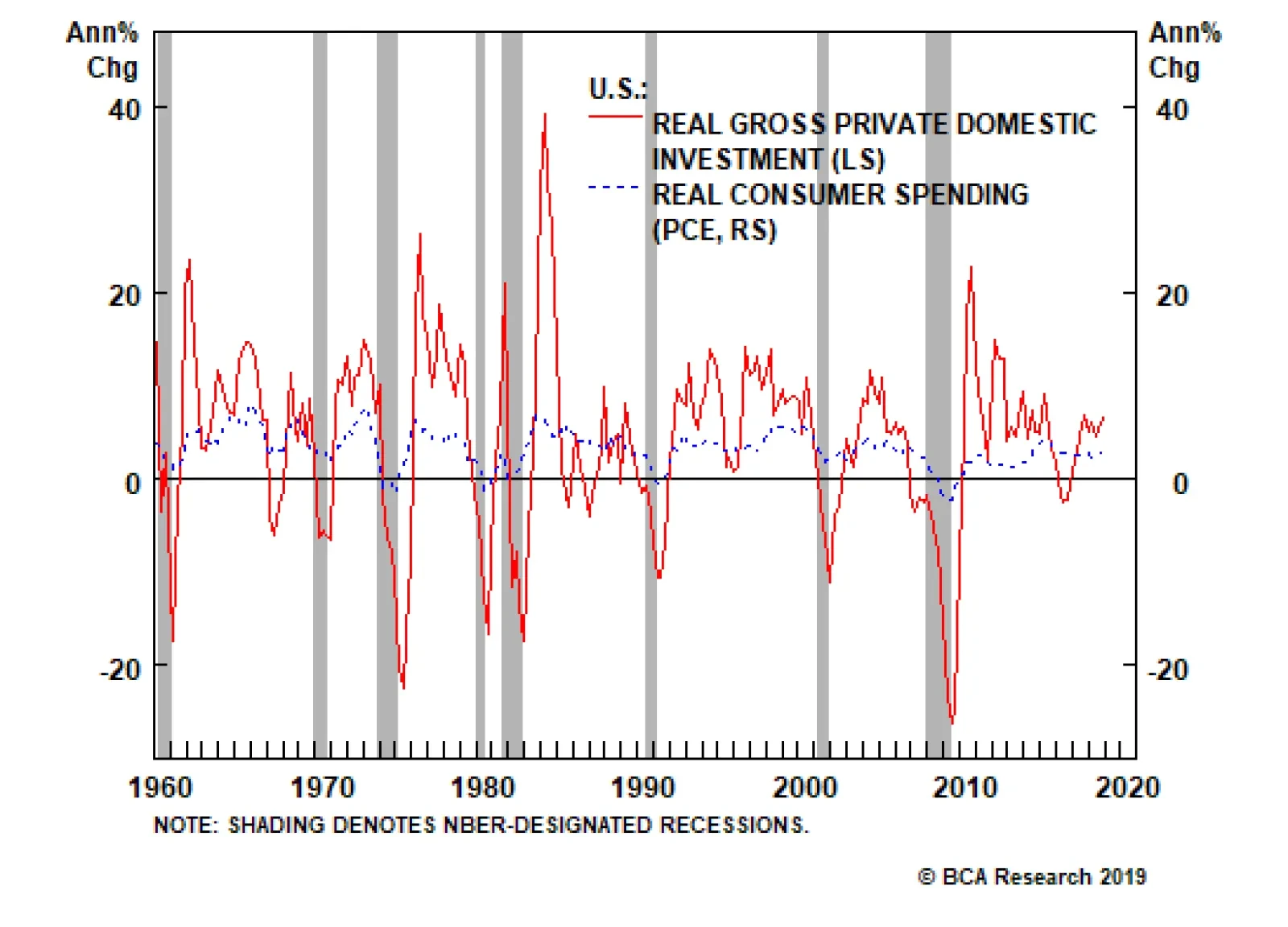 Consumption has been a relatively stable series over time, however, and its infrequent contractions tend to be pretty modest. The story is quite different for private domestic investment, which routinely makes wild swings, and…