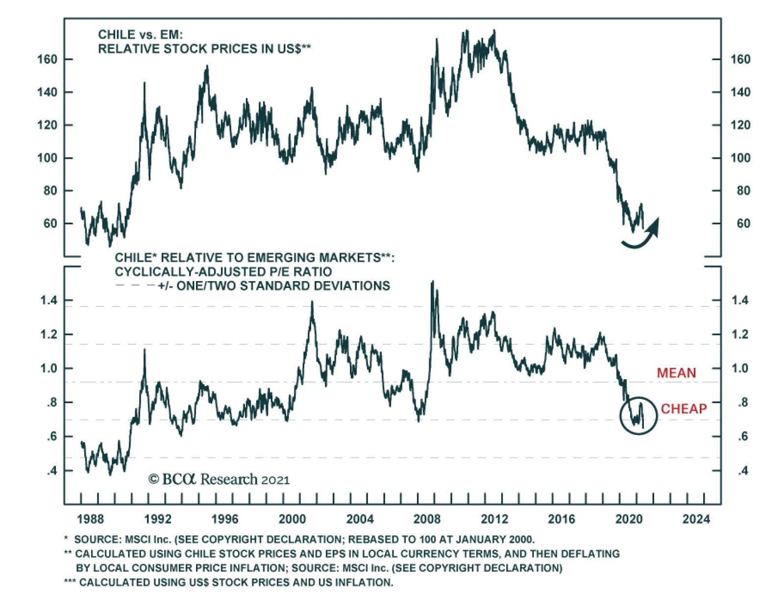Highlights Political volatility and uncertainty have peaked for the time being, which should serve to reduce the equity risk premium in Chile. Chilean equities are cheap. We are upgrading Chilean stocks from underweight to overweight…