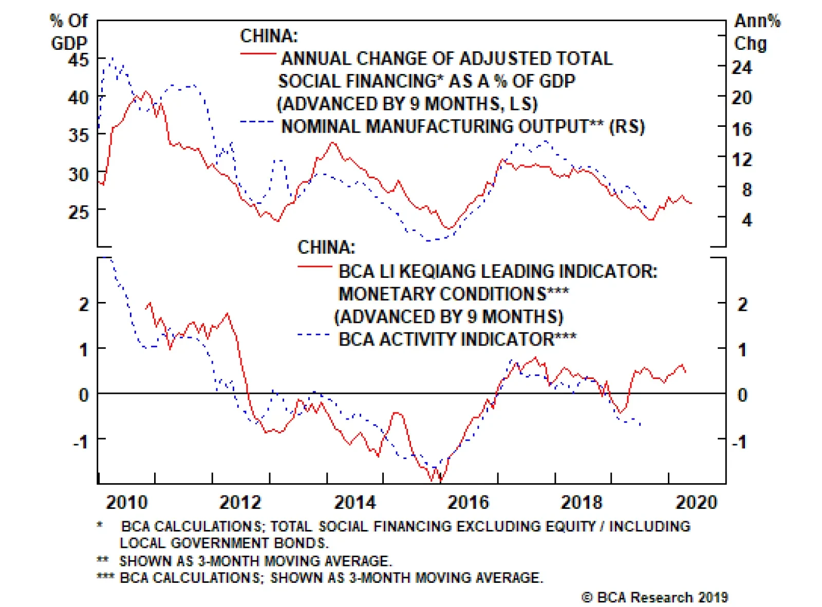 However, our level of confidence that the existing stimulus will be sufficient to stabilize economic growth is lower than it otherwise would be. This is due to the fact that the challenges facing the Chinese economy are unprecedented in nature. For one, the indirect impact of the trade war on China’s economy through business sentiment and manufacturing investment has yet to be fully revealed in the data. As Chart 6 shows, manufacturing investment is already deteriorating, particularly in export-intensive sectors. The ultimate impact on investment from the trade war is still uncertain, and can pose significant downside risks to the Chinese economy in the coming year. More importantly, as Chart 7 suggests, a weak credit impulse will at best lead to a very subdued economic recovery even if growth does indeed bottom. In terms of the link between policy and the economy, Chart 8 points out a key difference between the current slowdown and previous down cycles: Monetary conditions have been ultra-loose for more than a year, but current economic conditions remain on a downward trend – much more so than in the previous cycles. This huge gap and lag in economic response to monetary stance can only be explained by an impaired policy transmission mechanism. An expansionary monetary stance has not proportionally translated into credit expansion or economic recovery. This challenges the effectiveness and timeliness of future monetary loosening in terms of its ability to revive the Chinese economy. Chart 7Current Pace Of Credit Growth Will Lead To A Fragile Recovery, At Best