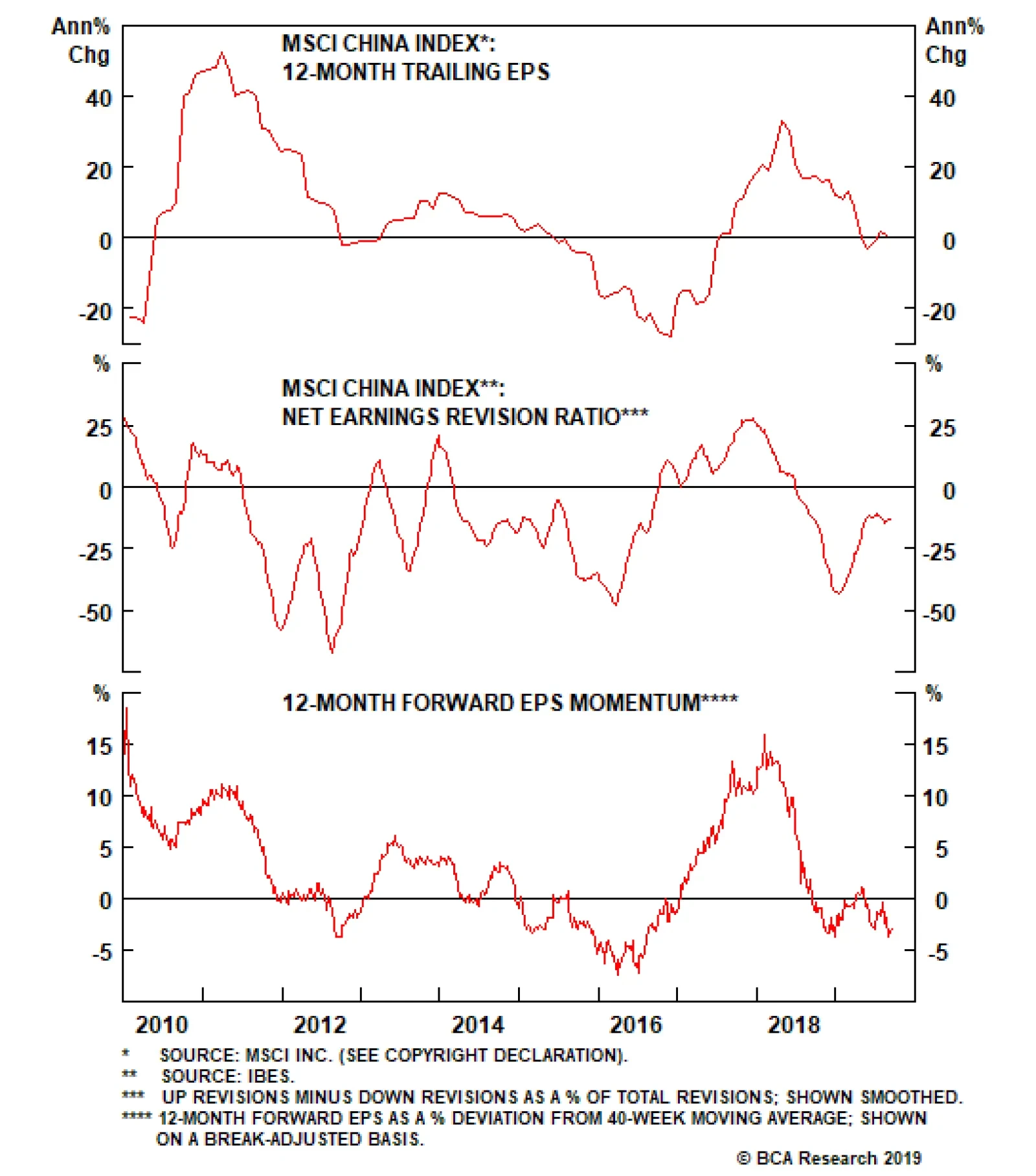 Thus, the conclusion is that Chinese policymakers appear to be in control of the currency. The reduced risk of an uncontrolled decline has allowed policymakers to (passively) provide meaningful stimulus to the domestic economy via depreciation. Indeed, the RMB has not only depreciated against the USD, but also against many Asian currencies including direct trade competitors such as Vietnam and Taiwan (Chart 13). This is helping offset the negative impact of U.S. tariffs on Chinese exporters. But currency devaluation can come with a price tag – in particular for corporations that have borrowed heavily in U.S. dollar-denominated debt. We estimate that $440 billion of U.S. dollar debt will be maturing over the coming two years, for Chinese companies and banks in the aggregate.7 A 12% depreciation in the RMB since April 2018 means that debt servicing costs will be 12% higher for unhedged debtors. This is particularly painful for real estate and financial services companies, two of the largest holders of U.S. dollar-denominated loans, and the weakest sectors in the current economic downturn. Most importantly, while currency devaluation ease the slowdown, it cannot be counted on to stabilize Chinese economic activity on its own. For example, while our earnings recession model suggests that the decline in the RMB since May has reduced the odds of a major decline in economic activity by roughly 20%, the model also shows that such an event is still highly probable (current odds are roughly at 70%). Bottom Line: Barring a successful (even if temporary) trade deal, we expect more weakness in the RMB as a passive source of reflation to aid the economy. But currency devaluation is a double-edged sword, and cannot be counted on to single-handedly stabilize China’s economy if a further slowdown occurs. An Update On Corporate Earnings Against a backdrop of what may turn out to be insufficient policy support, the earnings picture is providing one modest positive for equity investors. While the growth rate in investable earnings per share has slowed significantly over the past year (Chart 14), it has merely fallen to zero and not deeply into negative territory, as what seemingly occurred in 2015-2016. In our view, the risk of a similar collapse in earnings per share (EPS) has been an important factor weighing on Chinese investable equities’ relative performance since June 2018. In reality, a closer examination of MSCI China Index earnings reveals that a huge decline in EPS this year was never really a threat, because the apparent collapse in 2015-2016 did not actually transpire. Changes to the composition in the MSCI China Index that took effect in November 2015 and June 2016 had the effect of depressing index EPS, due to the sizeable inclusion of a set of richly valued stocks. Chart 15 presents BCA’s calculation of “break-adjusted” EPS for Chinese investable stocks, which shows that EPS growth bottomed out at -10% in late-2016, as opposed to the -28% implied by the unadjusted series. Chart 14Investable EPS Has Yet To Contract Meaningfully