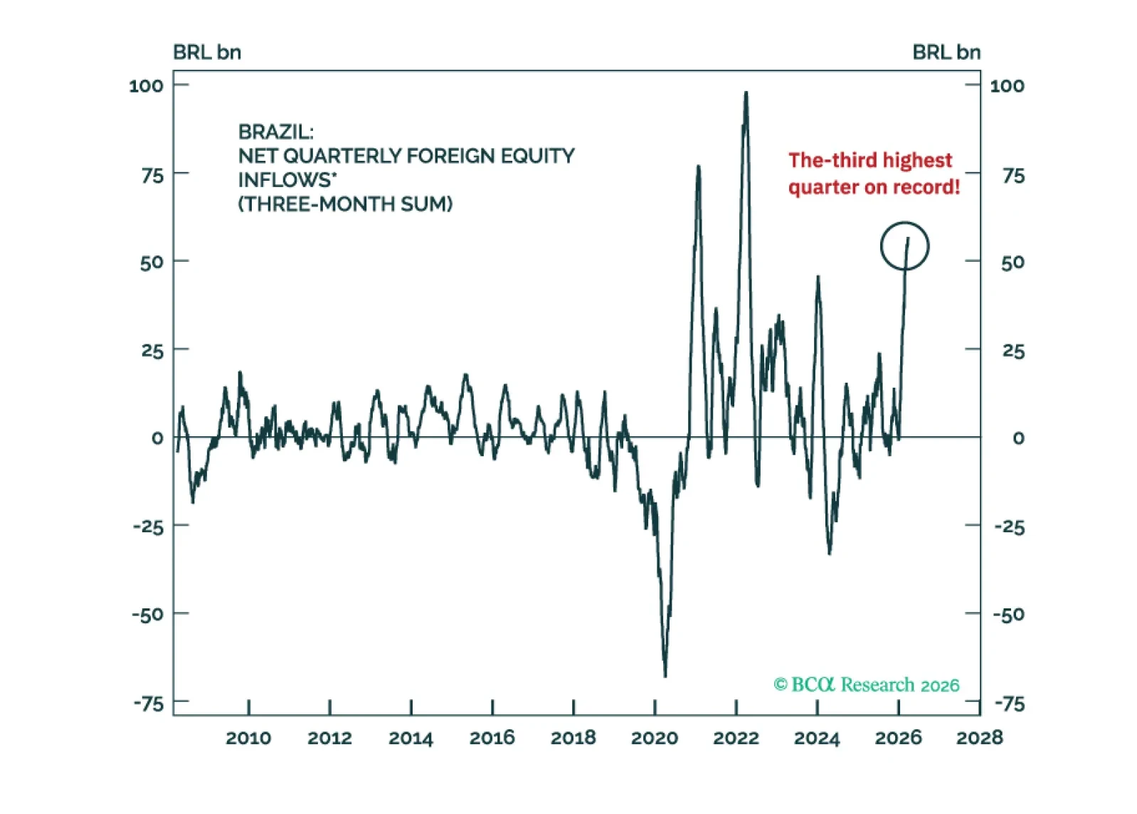Overstretched foreign inflows into Brazilian markets will reverse, while soaring oil prices will not benefit Brazil in the near term. Avoid the country’s risk assets and the BRL, and stay underweight Brazilian equities and fixed income relative to EM. We also recommend paying 10-year Brazilian swap rates.