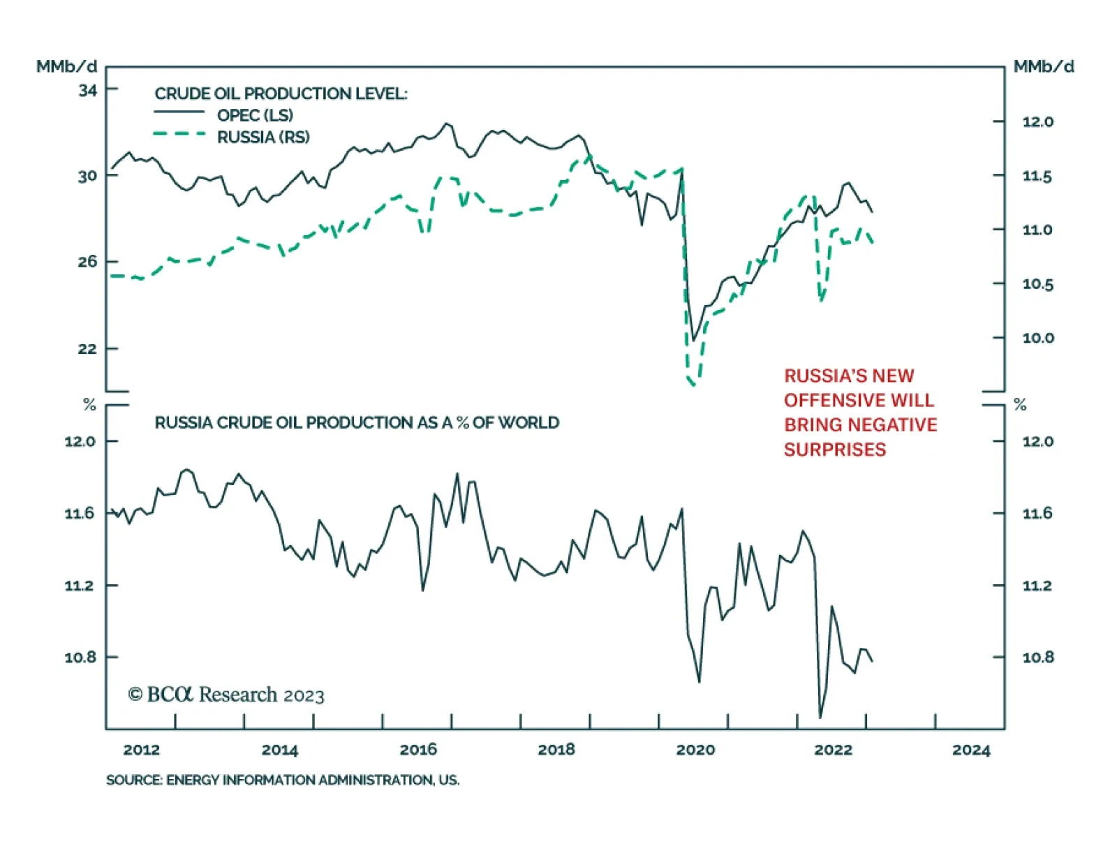 High realized inventories are weighing on global oil prices. We expect oil market deficits will draw on accumulated inventories over the forecast period. Petro-state instability – arising mainly from Russia and the Middle East – is a key geopolitical trend in 2023 and will likely lead to oil supply shocks. We are revising our Brent price forecasts to $97/bbl this year and $111/bbl in 2024. Investors should brace for upward price pressure – as long as recession risks remain contained – and persistent high volatility.