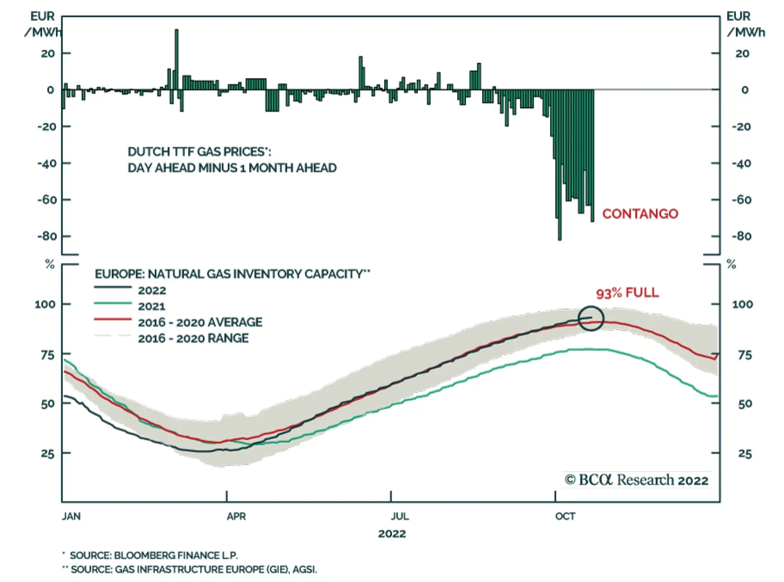 Despite uncertainty and intrusive government policy, natural gas and oil markets have managed to direct much-needed supplies to Europe going into winter. Natgas markets attracted massive LNG inflows – at a cost of record-high prices – that now leave the continent’s on-land storage close to full. A floating LNG market now exists on Europe’s Atlantic Coast – made possible by spot prices at the Dutch Title Transfer Facility trading ~ 40% below 1Q23 futures. The TTF futures contango market structure allows unsold cargoes to be stored on vessels off the coast of Europe until needed this winter via hedging (e.g., buy spot, sell 2- to 3-month-forward futures to lock in storage costs). This expands storage for the continent, leaving the EU in much better shape to weather the loss of Russian pipeline gas.