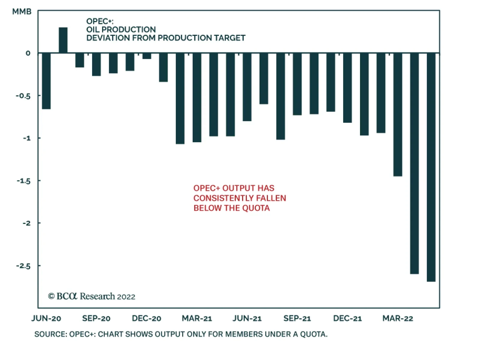 Russia will have to lower oil production to ensure output it hasn’t placed with non-EU buyers does not tax its limited storage facilities, ahead of the bloc’s December 5 embargo. The EU’s insurance/reinsurance ban on ships carrying Russian material also commences in December. It will profoundly affect Russian output, if fully implemented. Russian and Chinese firms will expand ship-to-ship transfers on the high seas, along with external processing and storage services to mask crude and product exports. The EU embargos will force Russia to shut in ~ 1.6mm b/d of output by year-end, rising to 2mm b/d in 2023, by our reckoning. Gas-to-oil switching in Europe will boost distillate and residual fuel demand by ~ 800K b/d this winter. Chinese policymakers will be compelled to deploy greater fiscal and credit support to reverse weakening GDP. Tighter monetary policy in DM economies will dampen aggregate demand. Bottom Line: EU embargoes on Russian oil imports will significantly tighten markets, and lift Brent to $119/bbl by year-end. This has a 60% chance of being offset by ~ 1mm b/d of Iranian oil exports in 2023, in our estimation. We are maintaining our Brent forecast at $110/bbl on average for this year, and $117/bbl next year. WTI will trade $3-$5/bbl lower. At tonight’s close we are re-establishing our long COMT ETF position. Risks remain to the upside. Feature Chart 1Russia’s Crude Oil Output Will Fall