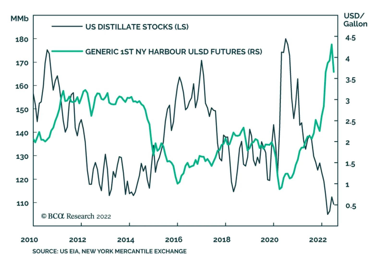 Given these views, we remain long the oil and gas producer XOP ETF, which is up 19.5% since we re-established it on July 5, and, at tonight’s close, will be re-establishing our COMT ETF, to take advantage of higher energy and commodity prices and increasing backwardation in oil markets as inventories draw. Robert P. Ryan Chief Commodity & Energy Strategist rryan@bcaresearch.com Ashwin Shyam Research Analyst Commodity & Energy Strategy ashwin.shyam@bcaresearch.com Paula Struk Research Associate Commodity & Energy Strategy paula.struk@bcaresearch.com Commodities Round-Up Energy: Bullish US distillate inventories – diesel and heating oil mostly – were up less than 1% for the week ended 12 August 2022, according to the US EIA. US distillate inventories stood at 112mm barrels. This did nothing to reverse the deep drawdown in distillate inventories of 18.5% y/y, which, along with European stocks, refiners are attempting to rebuild going into the 2022-23 winter. We expect natgas-to-oil switching this winter to add 800k b/d of demand to the market over the Nov-Mar winter season. Most of this demand will be for distillates, in our view, given its dual use as a fuel for industrial applications and household space-heating. Distillate demand could be higher this winter, if a La Niña produces colder-than-normal temperatures. The US Climate Prediction Center gives the odds of such an outcome 60% going into the 2022-23 winter. This would lift ultra-low-sulfur diesel futures in the US and gasoil futures in Europe higher as inventories draw (Chart 8). Base Metals: Bullish Copper prices dropped on weaker-than-expected Chinese macroeconomic data for July, although the fall was bounded by the People’s Bank of China’s decision to cut interest rates. According to US CFTC data, copper trading volumes are lower than pre-pandemic levels, as hedge funds' net speculative positions turned negative beginning in May and have mostly remained in the red since then. Low trading volumes will result in copper prices being highly susceptible to macroeconomic events, especially those occurring in China. Precious Metals: Neutral Gold prices are facing difficulty overcoming market expectations of high interest rates for the rest of this year (Chart 9). The bearish influence of tightening monetary policy and a strong USD has the upper hand on the supportive effect of recession risks, inflation, and geopolitical uncertainty for gold prices. Recent strength in US stock markets - which historically is inversely correlated with gold prices - following better-than-expected earnings, also contributed to recent gold price weakness. Chart 8