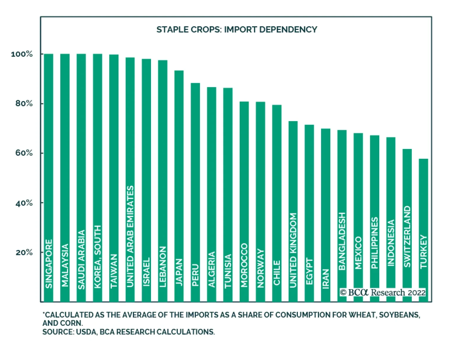 Russia also wields immense influence in Central Asia and significant influence in the Middle East. These are the critical regions for China’s Eurasian strategy, symbolized in the Belt and Road Initiative. Chinese investment in the former Soviet Union has lagged its investment in the Middle East and the rest of Asia but the Ukraine war will change that. China will have an historic opportunity to invest in the former Soviet Union, on favorable terms, to secure strategic access all the way to the Middle East (Chart 9). China will always prioritize its East Asian neighbors as investment destinations but it will also need alternatives as the US will inevitably seek to upgrade relations with Southeast Asia. Another reason China must accept Russia’s overtures is that China is aware that it would be strategically isolated if the West pulled off a “Reverse Kissinger” maneuver and allied with Russia. This option seems far-fetched today but when President Putin dies or is overthrown it will become a fear for the Chinese. There has never been deep trust between the Chinese and Russians and the future Russian elite may reject the idea of vassalage to China. Therefore just as Russia needs China today, China will need Russia in the future. Why The Middle East Will Rumble Again The Middle East is destabilizing once again and Russia’s invasion of Ukraine will reinforce this trajectory. Most directly, the reduction in grain exports from Russia and Ukraine will have a disproportionate impact on food supplies and prices in countries like Pakistan, Turkey, Egypt, Libya, and Lebanon (Chart 10). A new shatter-belt will take shape not only in Russia’s and China’s neighborhood, as they seek to establish spheres of influence, but also in the Middle East, which becomes more important to Europe as Europe diversifies away from Russia. Part of the strategic purpose of Russia’s invasion is to gain greater naval access to the Black Sea and Mediterranean, and hence to expand its ability to project power across the Middle East and North Africa. This is both for general strategic purposes and to gain greater leverage over Europe via its non-Russian energy and supply sources. Chart 10A New Shatter-Belt Emerging