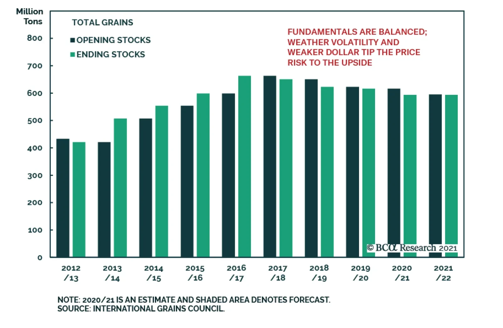 Going into the new crop year, opening and closing stocks are expected to remain flat overall vs the current crop years, with changes in production and consumption largely offsetting each other in grain and bean markets (Chart 2).1 This will leave overall prices a function of weather – which no one can predict – and the path taken by the USD over the coming year. The IGC's forecast calls for mostly unchanged production and consumption for grains and beans globally, with trade volumes mostly flat y/y. This leaves global end-of-crop-year carryover stocks essentially unchanged at 594mm tons. The USDA expects wheat ending stocks at the end of the '21/22 crop year up a slight 0.5%; rice down ~ 4.5%, and corn up ~ 4%. Below we go through each of the grain and bean fundamentals, and assess the impact of COVID-19 on global trade in these commodities. We then summarize our overall view for the grain and bean complex, and our positioning recommendations. Rice The IGC forecasts higher global rice production and consumption, and, since they expect both to change roughly by the same amount, ending stocks are projected to remain unchanged in the '21/22 crop year relative to the current year (Chart 3). The USDA, on the other hand, is expecting global production to increase by ~ 1mm MT in the new crop year, with consumption increasing by ~ 8mm MT. This leaves ending inventories for the new crop year just under 8mm MT below '20/21 ending stocks, or 4.5%. Chart 3Global Rice Balances Roughly Unchanged