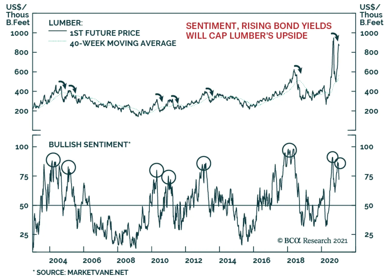 After an impressive run-up in mid-December, lumber prices now appear over-stretched and vulnerable to the downside. For one, sentiment is at levels that marked tops in the past, suggesting that prices are susceptible to a sell-off. Moreover, bond yields…