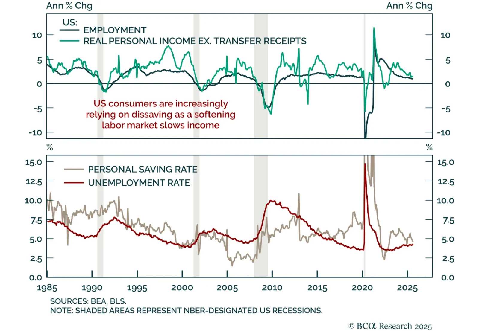 September consumption and income data beat estimates, showing a resilient US consumer but leaving the outlook fragile. Personal spending rose 0.6% m/m, outpacing income at 0.4%, pushing the saving rate down to 4.6%, its lowest level…
