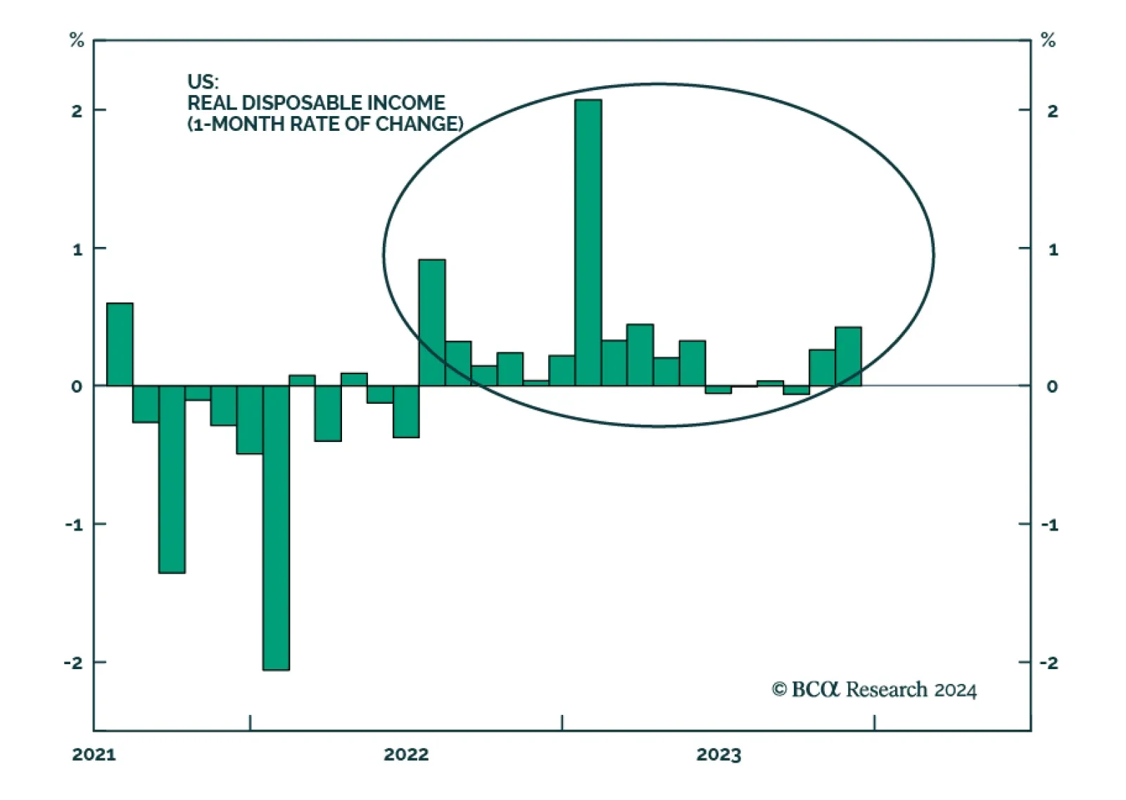 Growth in US disposable income has outpaced inflation nearly every month since mid-2022. Consumption is principally driven by income, but in the US it has gotten a meaningful assist the last two years from the drawdown of excess…