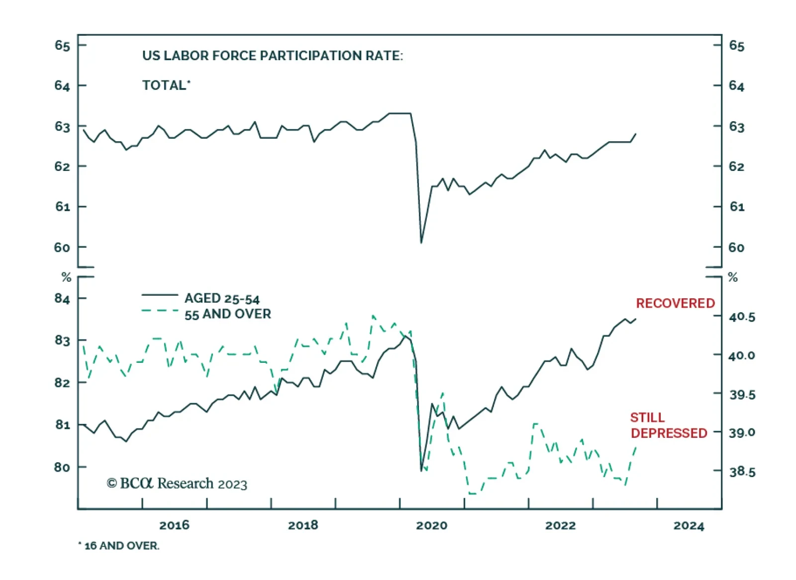 A sharp drop in the US labor force participation rate was among the pandemic disruptions that contributed to tight labor market conditions. The total participation rate collapsed from 63.3% in February 2020 to 60.1% in April 2020…