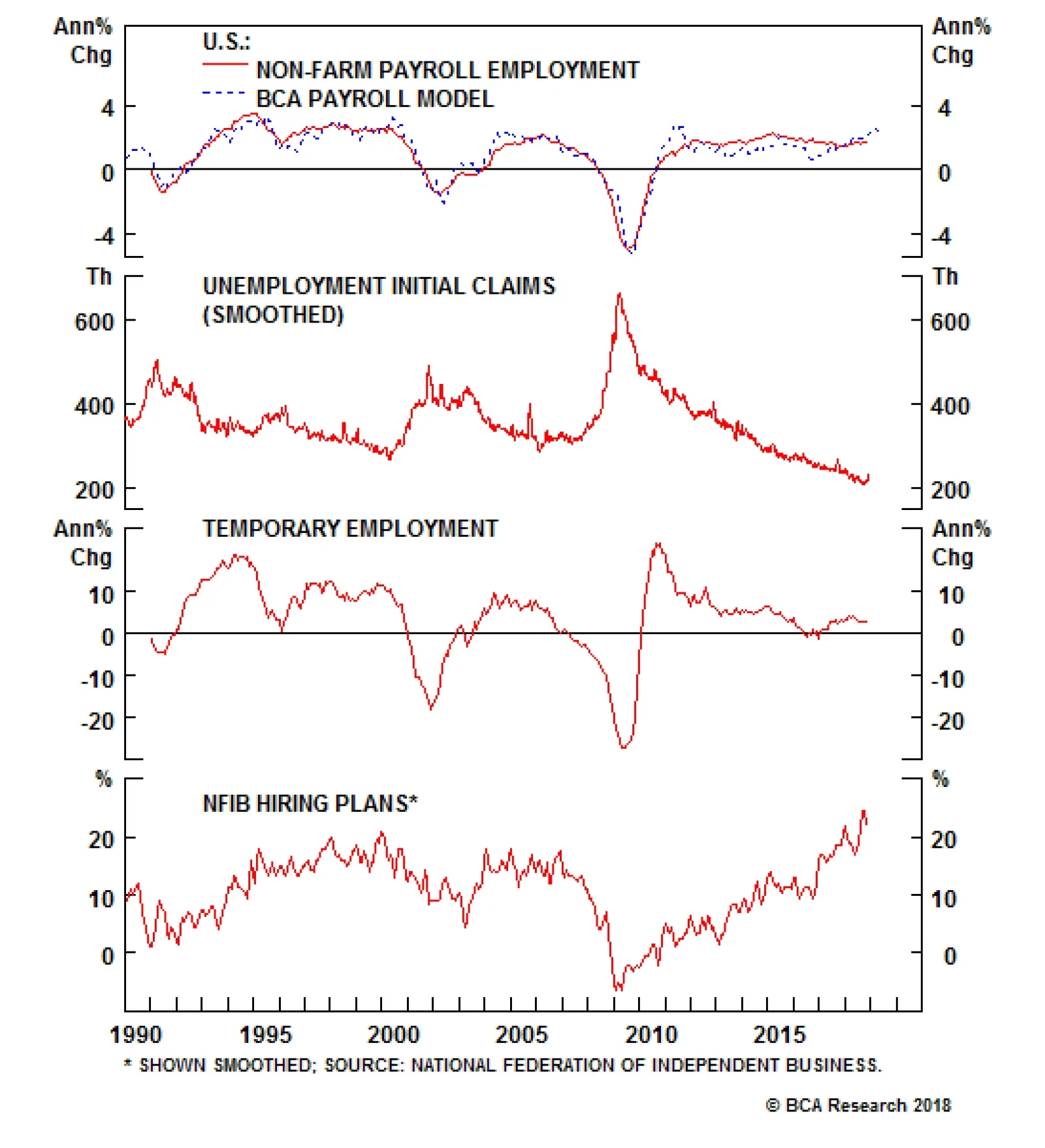 We do not worry about residential investment pulling down the economy,1 but we do pay close attention to nonfarm payrolls. Employment may be a coincident indicator, but it is powerfully self-reinforcing, and the sub-NAIRU2 unemployment rate looms large in the Fed’s policy calculus. Payrolls growth is robust, and our model projects that it will continue to be over the near term (Chart 4, top panel), as all of its components are in fine fettle, especially initial jobless claims (Chart 4, second panel), and small businesses’ hiring intentions (Chart 4, bottom panel). Chart 4Payrolls Should Keep Growing, ...
