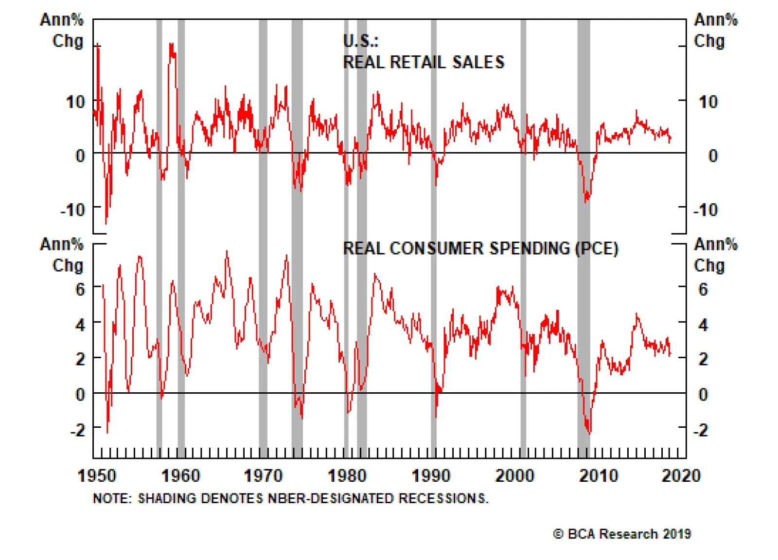 Last week’s data were mixed, but there is no doubt, as we’ve acknowledged throughout 2019, that the U.S. economy is decelerating. The deceleration has fanned recession fears, and the yield curve’s fleeting inversion two weeks ago added fuel to the fire.1 The sell-off in financial markets in the fourth quarter seemed largely to have been animated by concerns that the Fed was pushing the fed funds rate into restrictive territory. The sharp decline in equities, and the sharp rise in corporate bond yields, amounted to a material tightening in financial conditions that threatened to become a self-fulfilling prophecy. What a difference a quarter makes. The potent first-quarter rally has reversed much of the fourth quarter’s tightening of financial conditions (Chart 1), while the FOMC’s March meeting indicated that the Fed has pivoted from defending against inflation overshoots to trying to correct its extended post-crisis undershoot. The threat that the Fed would follow the typical path of tightening into a recession has now receded, at least for the rest of 2019. As long as inflation doesn’t suddenly flare up, the expansion should remain intact, provided that the Fed hasn’t already lifted short rates into restrictive territory. We have contended that it hasn’t, as the fed funds rate is comfortably below our current estimate of the equilibrium rate, and is even further below our year-end equilibrium projection. We are well aware that the equilibrium rate cannot be directly observed, and that our estimate may be off the mark. We therefore devote this week’s report to considering what the building blocks of GDP might look like if a recession were about to begin. We particularly focus on consumption, which accounts for the lion’s share of U.S. activity, and indirectly affects both investment and government spending.2 Is Consumption On A Recession Path? Retail sales contracted month-over-month in February, though upward revisions to the January data made the release something of a wash. Year to date, though, retail sales growth has not been strong enough to erase the disappointment from December’s lousy print. From a longer-term perspective, real retail sales don’t suggest anything definitive about the business cycle: although they’re in a mini downtrend, previous pre-recession slides have been steeper and/or longer (Chart 2, top panel). Growth in real personal consumption expenditures (PCE), the consumption input to GDP, has been trendless for the last three years, but is not in the extended slide that preceded other recessions, nor has it yet become stretched in this cycle (Chart 2, bottom panel). Chart 2Neither Here Nor There