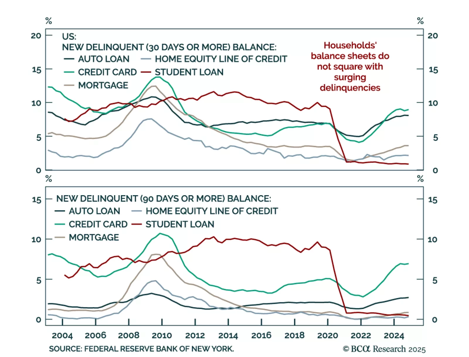 Households’ healthy balance sheets do not square with the rise in credit cards and auto loans delinquencies. The tailwinds that have supported higher-income cohorts’ spending have faded, presaging broad-based deterioration in credit…