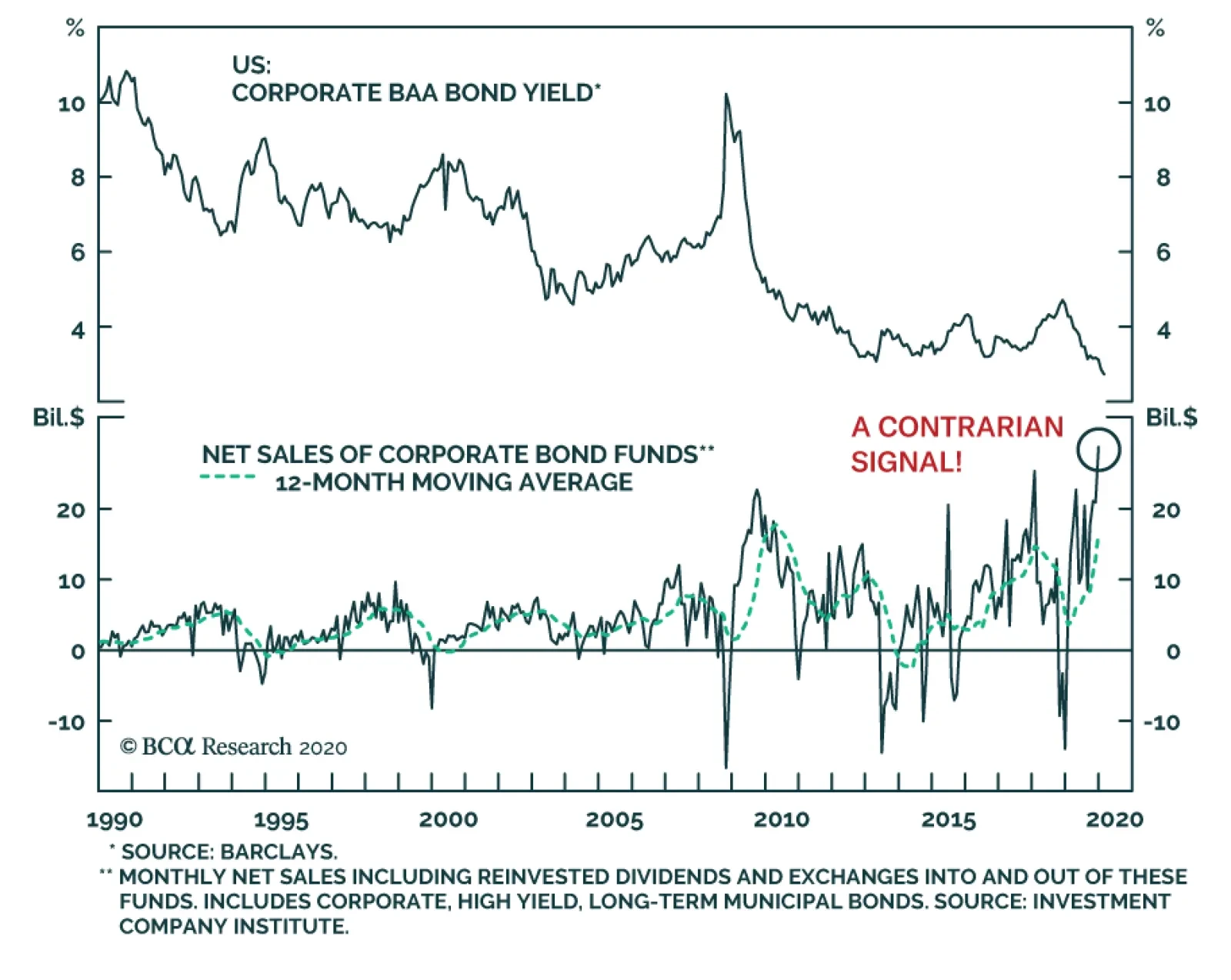 Corporate bond funds have been receiving record-high amounts of funds from the public in recent months. This is a contrarian indicator that usually coincides with a bottom in corporate baa bond yields. Essentially, the market is being supplied with a large…